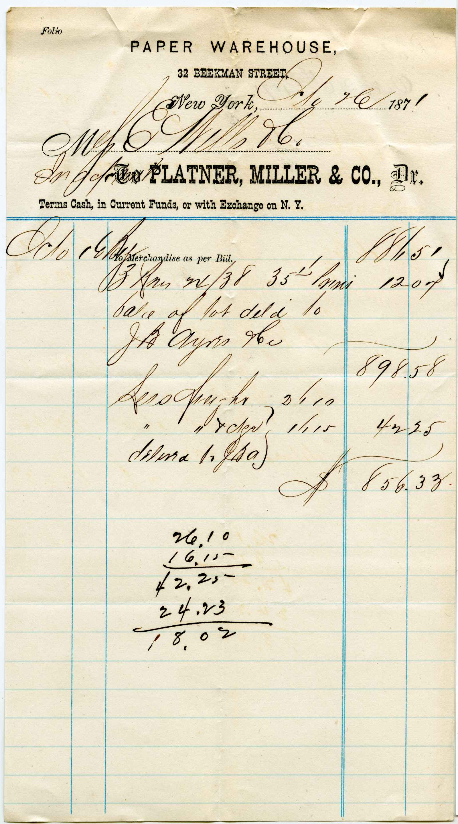 invoice; Platner, Miller & Co. - Paper Warehouse - 32 Beekman St. - N. Y.