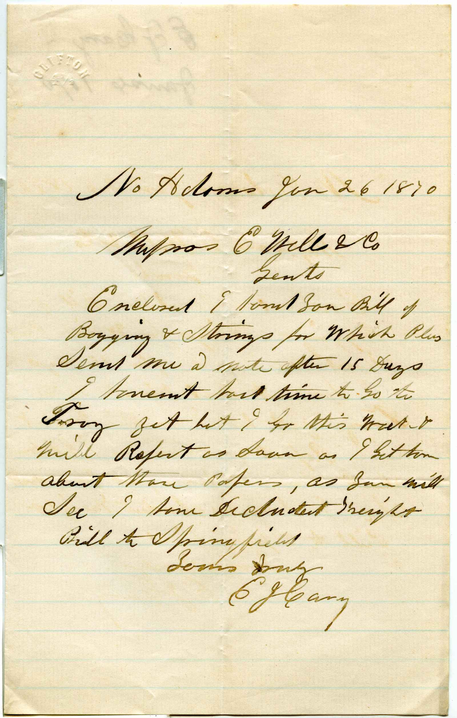 incoming correspondence to the papermaking company of Elisha Wells - circa 1870