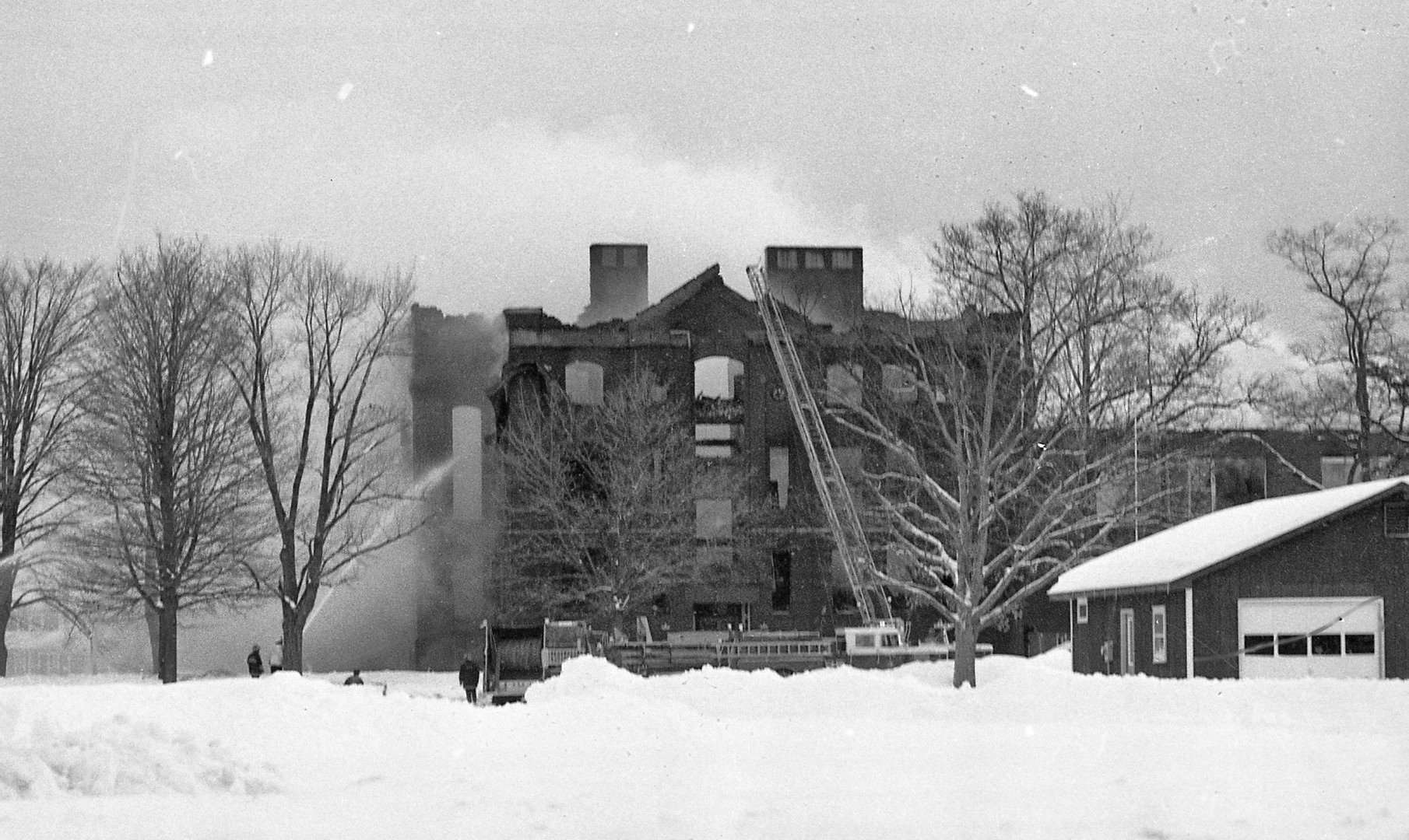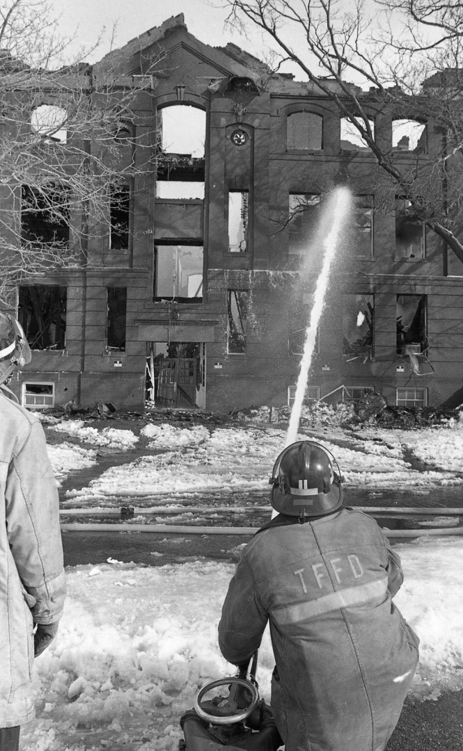 The Sheffield Middle School in Turners Falls, Massachusetts is destroyed by fire on a below-zero, morning, January 23, 1987.