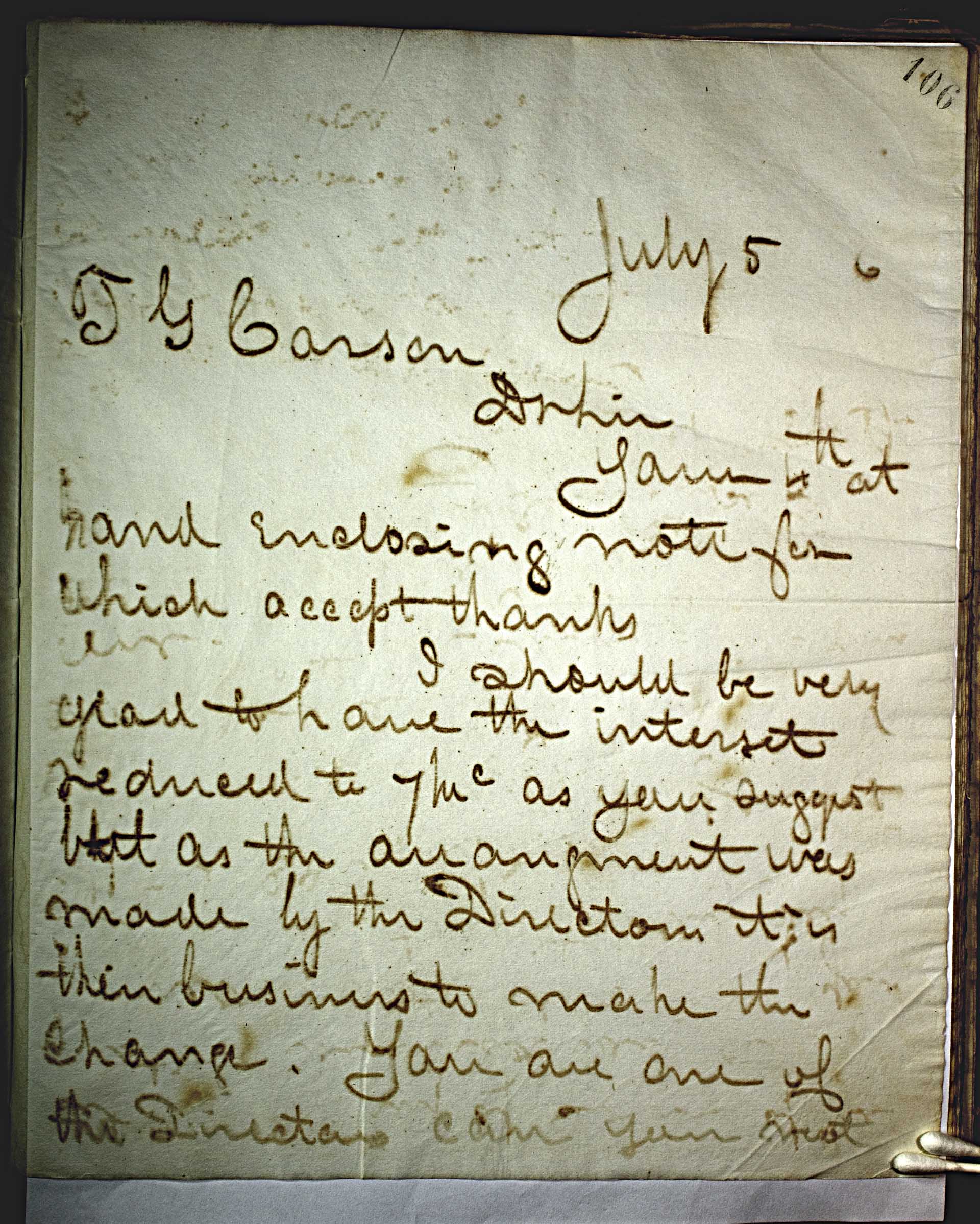 July 5 6 [1876] -- T.G. Carson -- Dear Sir -- I am 4th at hand enclosing note for which accept thanks. -- I should be very glad to have the interest reduced to 7 -- prc -- as you suggest but as the arrangement was made by the directors it is their business to make the change. You are one of the directors can you not. --