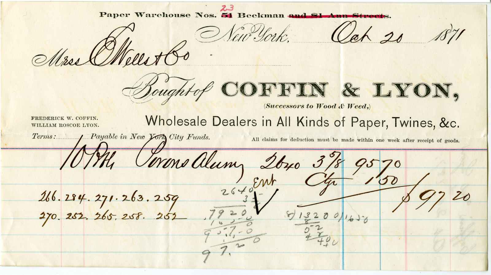 invoice; Coffin & Lyon - Wholesale Paper Warehouse - N.Y.