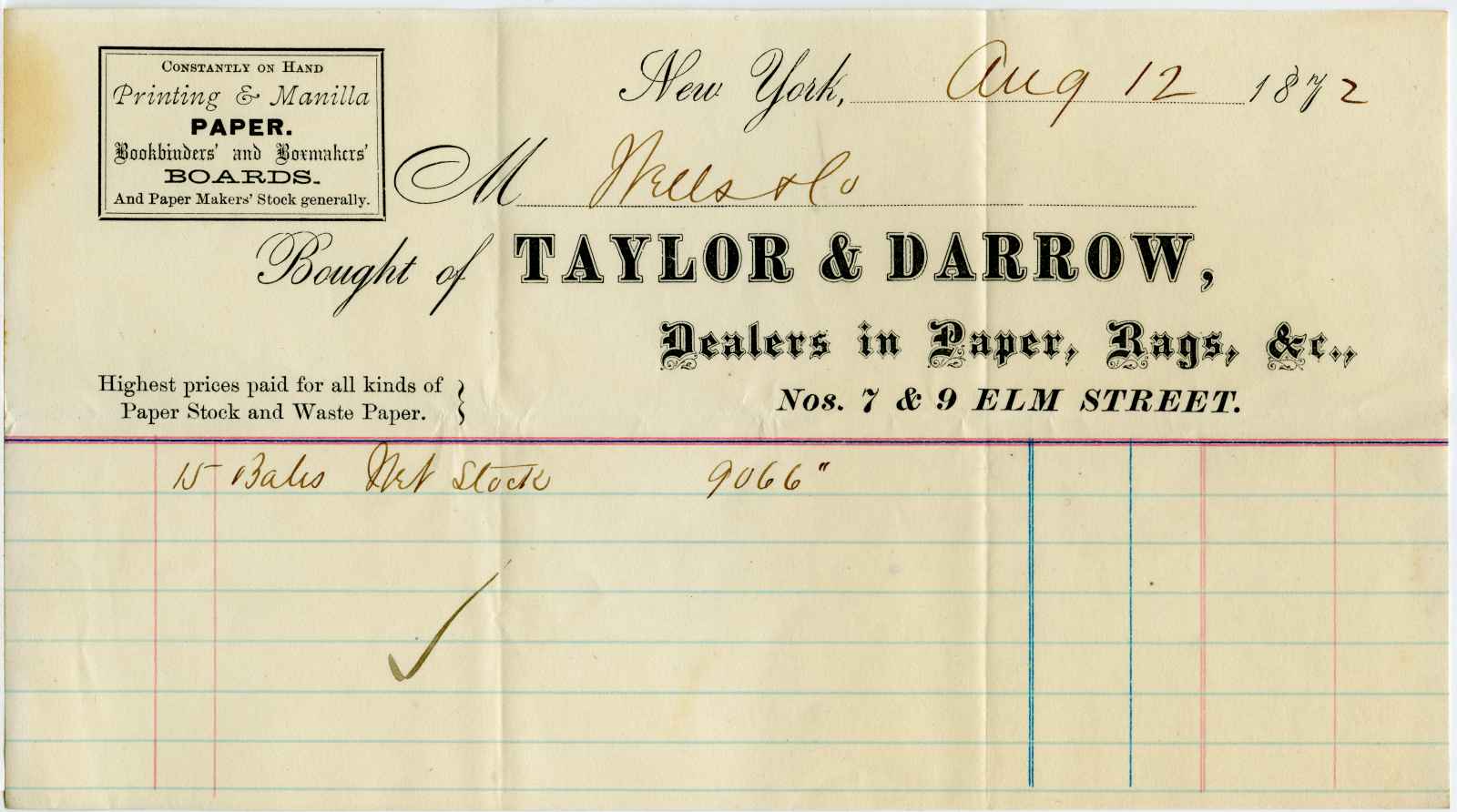 invoice; Taylor & Darrow - 7 & 9 Elm St - N.Y. Dealers in Paper, Rags, &c.
