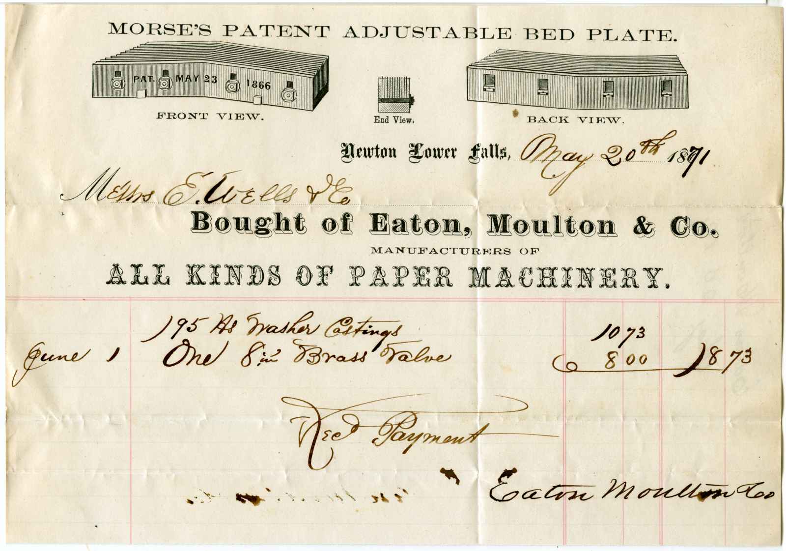 receipt; Eaton, Moulton & Co. - All kinds of paper machinery - Newton Lower Falls, Ma.