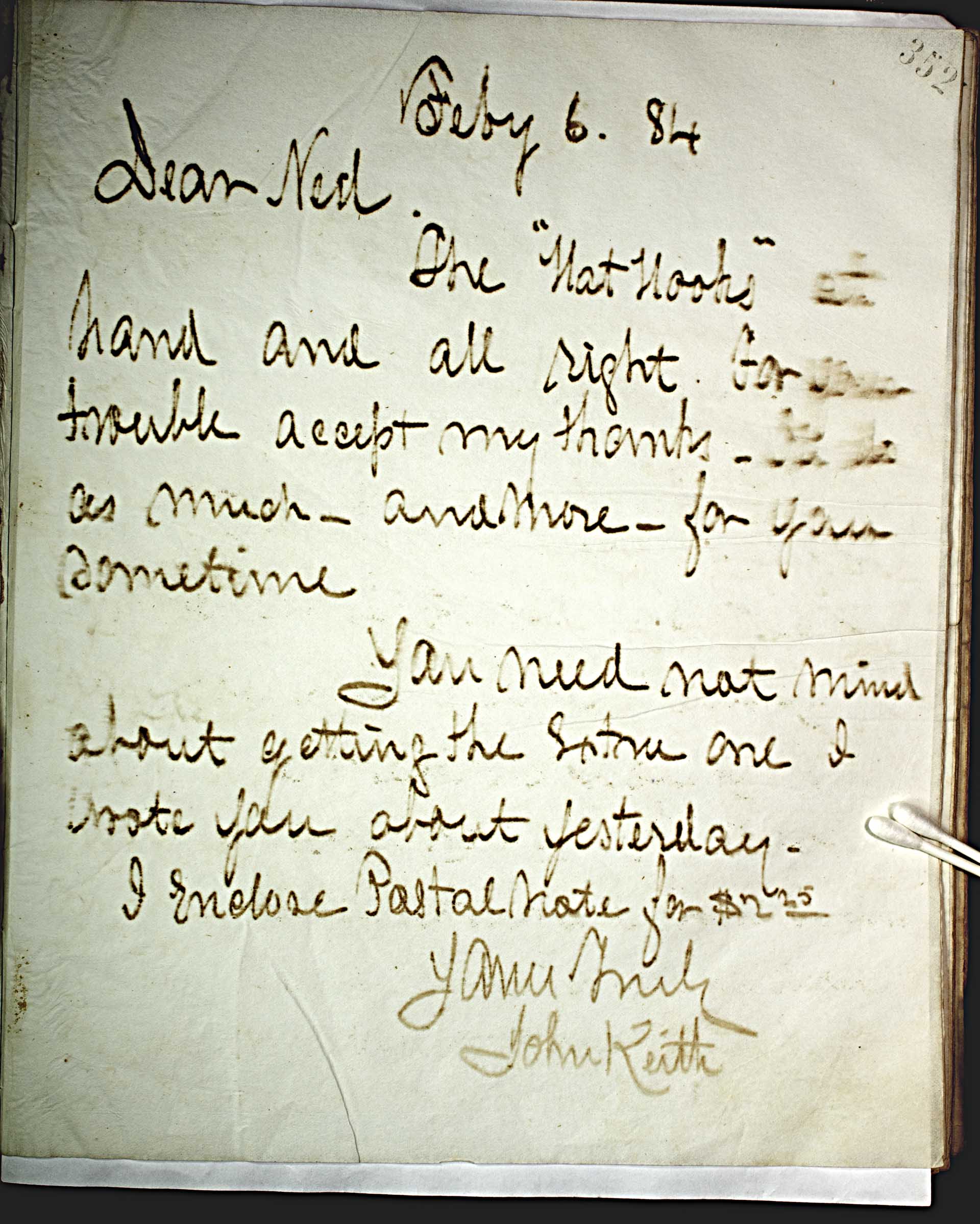 Feby. 6, 84 [1884] -- Dear Ned, -- The “Hat Hooks” at hand and all right for your trouble. Accept my thanks. 'll do as much – and more – for your sometime. -- You need not mind about getting the extra one I wrote you about yesterday. I enclose postal note for $2 -- 25 -- . -- Yours truly John Keith