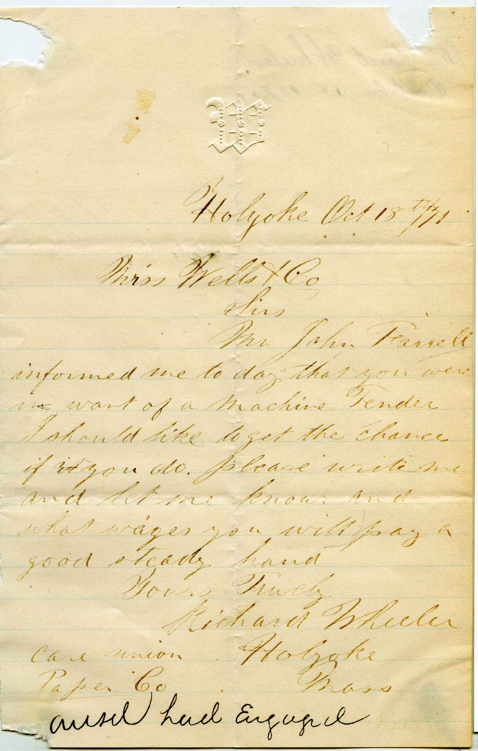 letter; Wheeler, Richard - Looking for employment - Holyoke, Ma.