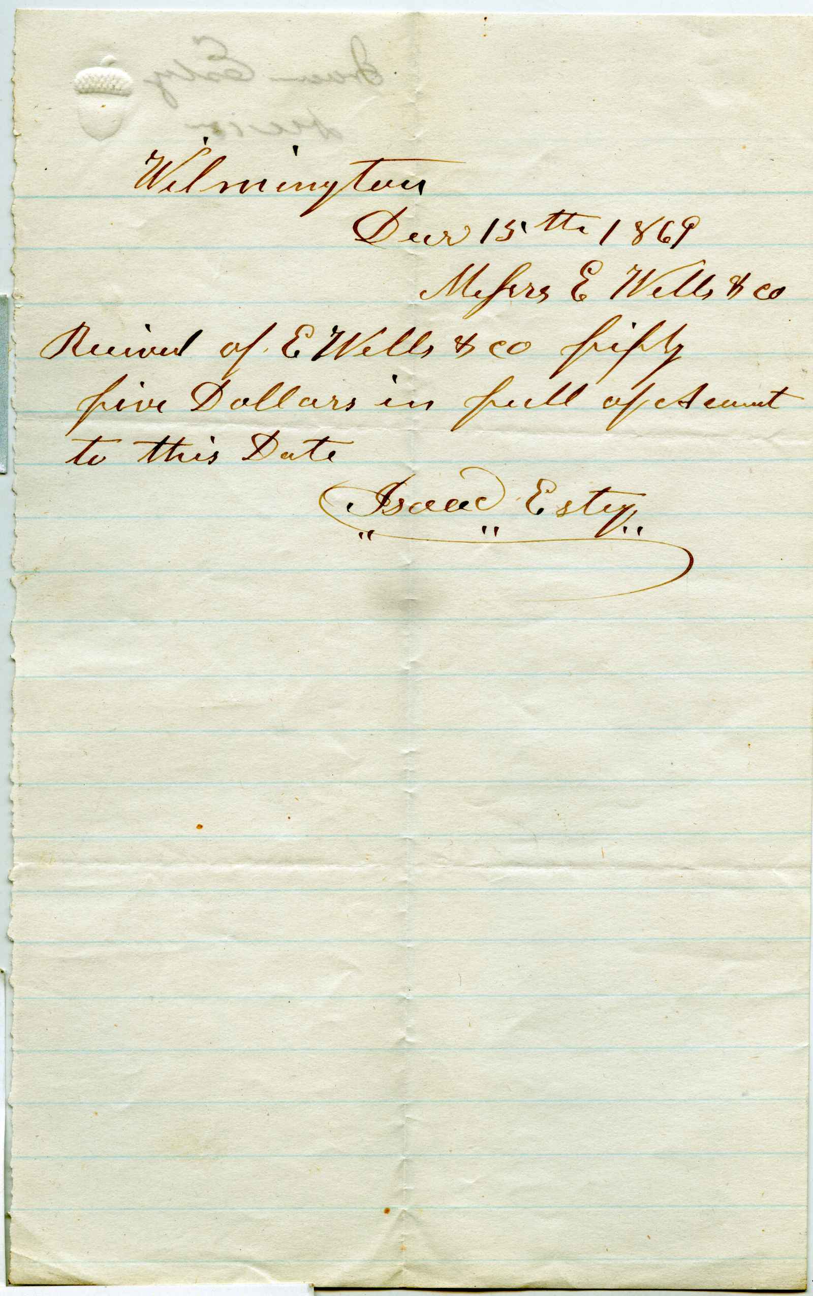 receipt; Estey, Issac - Cardstock - Wilmington, Vt.