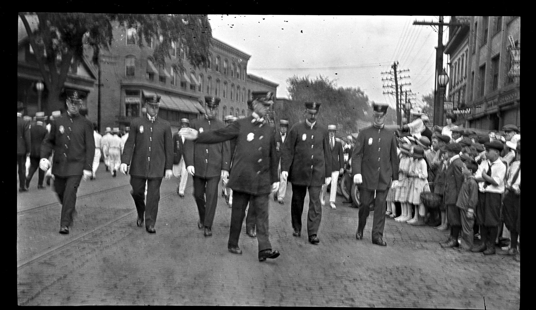 - The police contingent break ranks and head back to the station-house.
