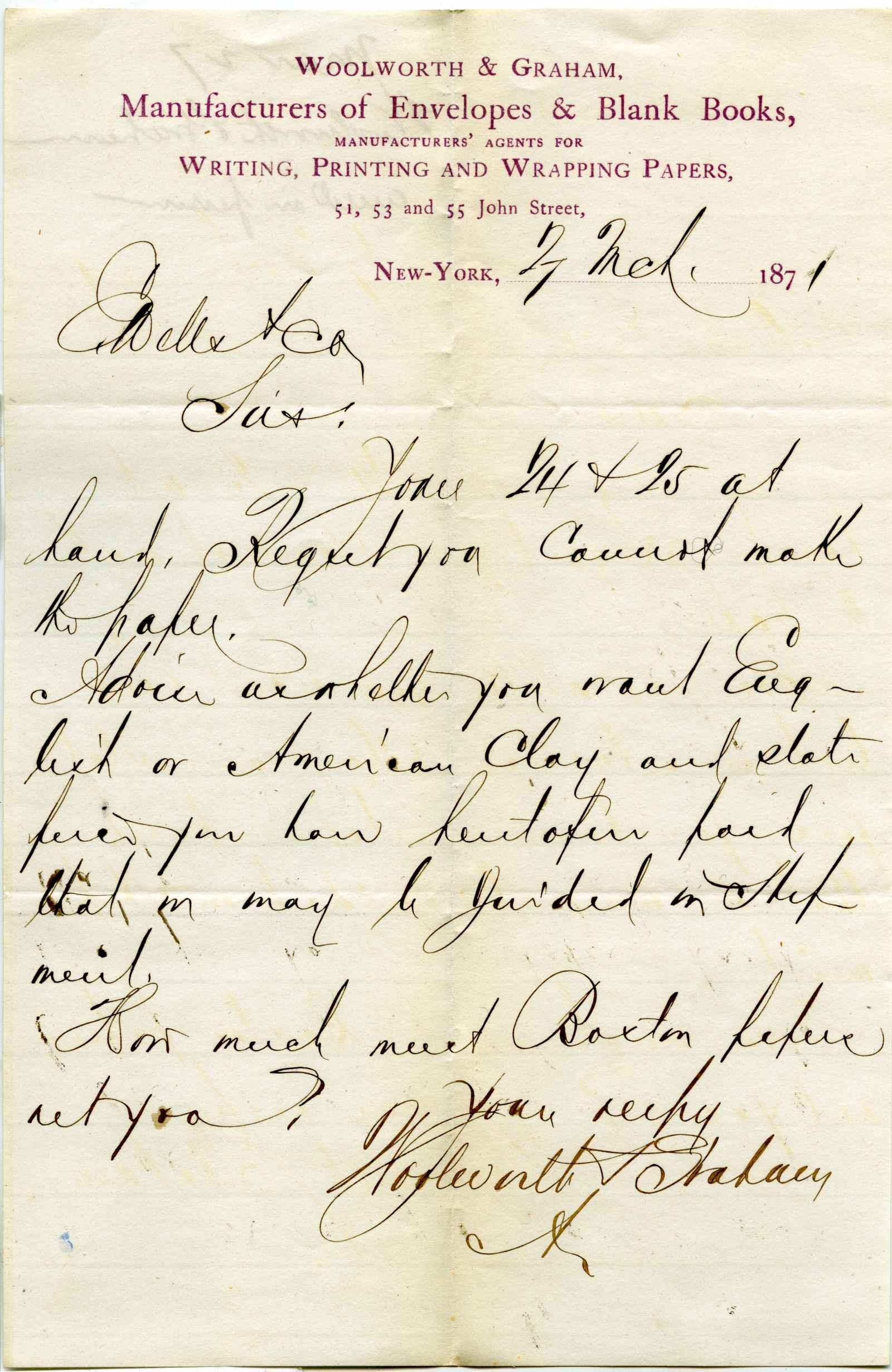 letter; Woolworth & Graham - Manufacturers of Envelopes and Blank Books - N.Y.