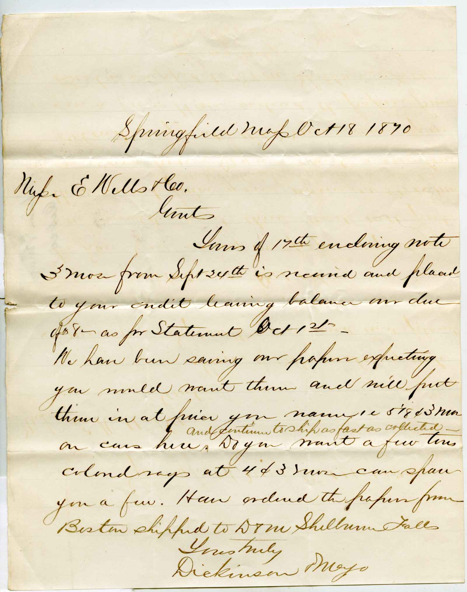 letter; Dickinson & Mayo - Paper Stock & Old Metals - Springfield, Ma.