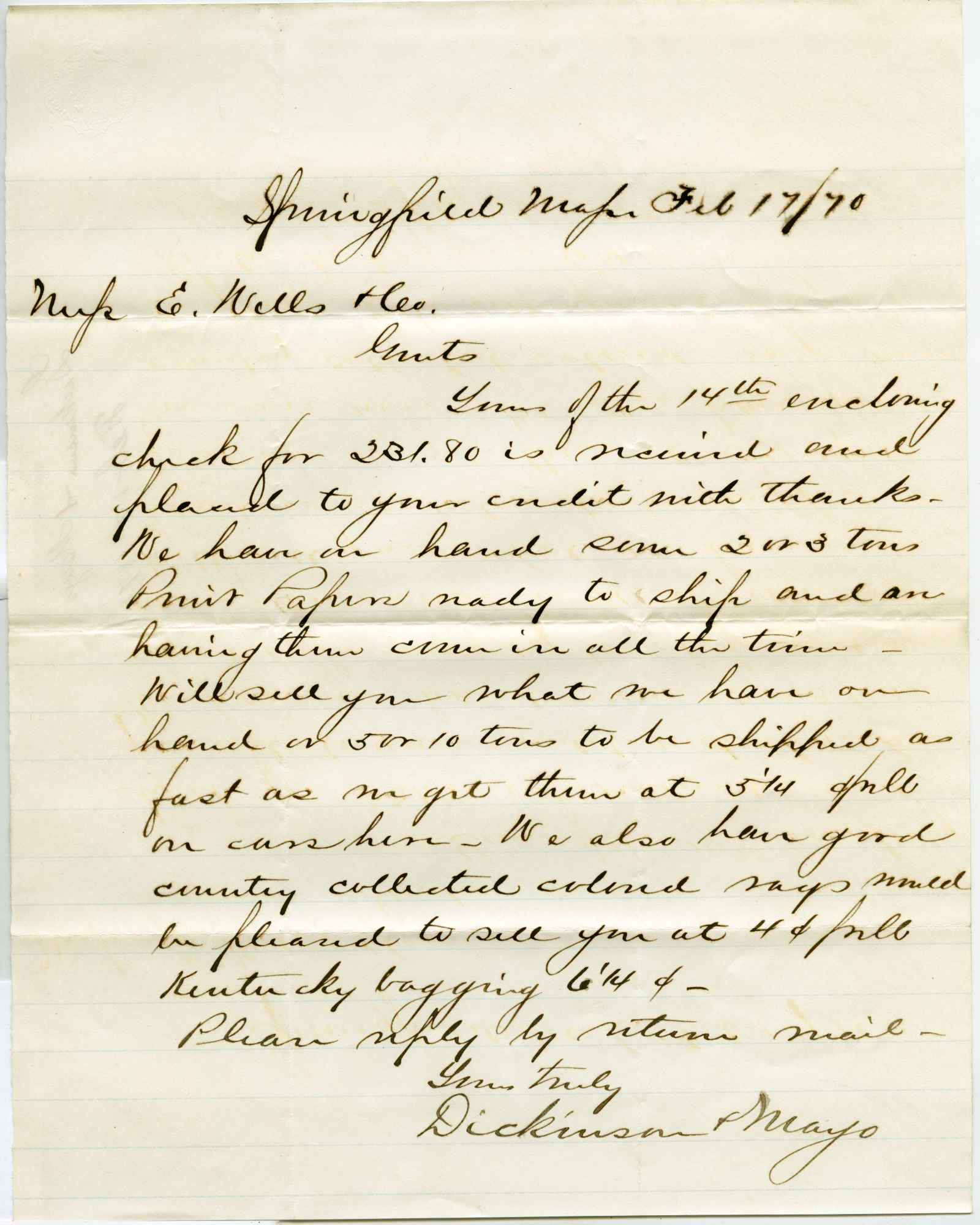 letter; Dickinson & Mayo - Paper Stock & Old Metals - Springfield, Ma.