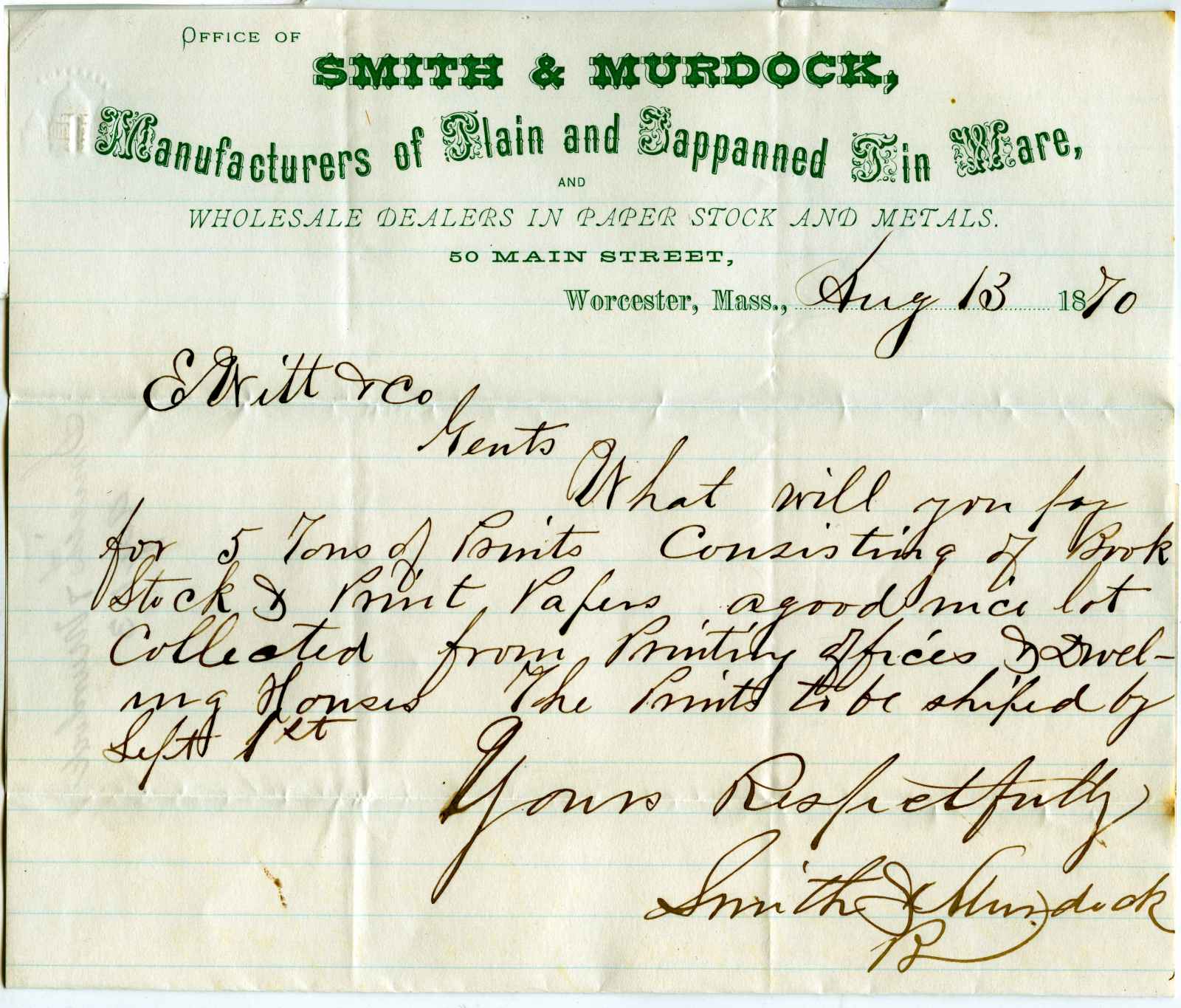 letter; Smith & Murdock - Mfrs. of plain & tappanned tin ware - Worcester, Ma.