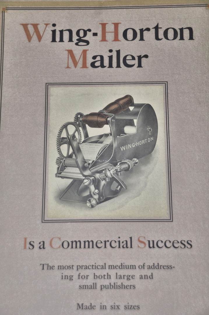 Chauncey Wings Sons Inc. was founded in 1896. The location is 78 Pierce St. in Greenfield. MA. Makers of the famous "Wing Mailer". <<<-->>>Since its invention in the 1880’s, the hand-operated original Wing Mailer has been the mainstay of newspaper mailrooms, the tried-and-true workhorse that can be used on its own or as a back-up for automated machinery in case of a power failure. Many of these Mailers have been in constant use for decades, with only an occasional replacement part or overhaul. Using our economical plain paper one-up continuous feed labels, the Mailer applies adhesive to the label as it feeds through the machine and then cuts it and applies it to the mailing piece, in one smooth motion.<<<-->>>Source: http://www.chaunceywing.com/documents/originalMailer.pdf