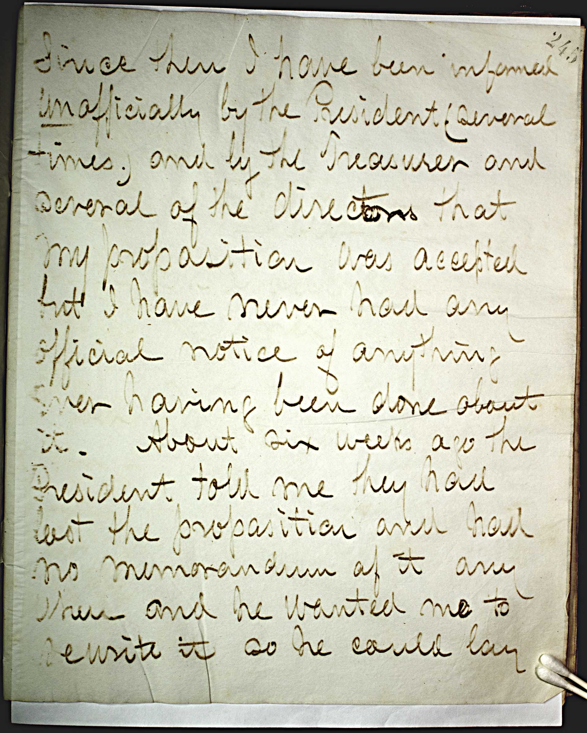 Since then I have been informed un officially by the President (several times), and by the Treasurer and several of the directors that my proposition was accepted but I have never had any official notice of anything ever having been done about it. About six weeks ago the President told me they had lost the proposition and had no memorandum of it any where and he wanted me to rewrite it so he could lay --
