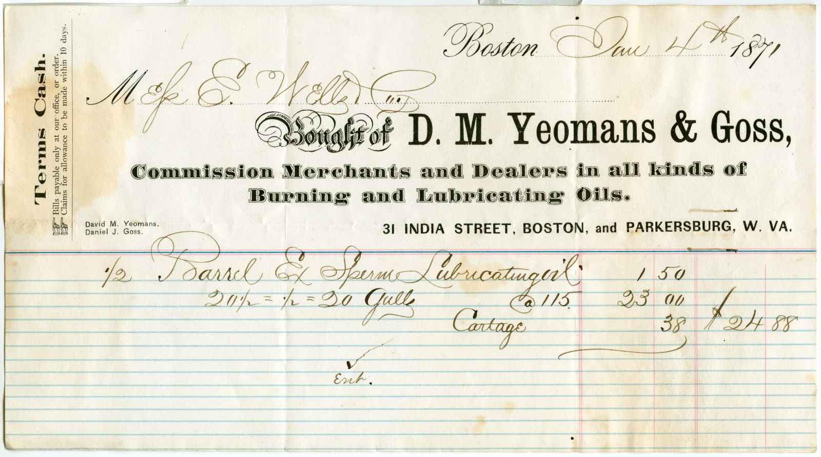 receipt; Yeomans, D. M. & Goss - Burning and Lubricating Oils - Boston