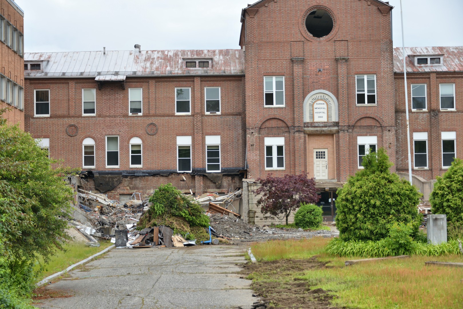 In 2021, the Farren Memorial complex is beyond its useful intent. The hospital owner, Trinity Health of New England, confers with the Town of Montague regarding the demolition of the entire structure and reclaim the land for future consideration as to its purpose. The principals agree to the demolition which begins on May 30, 2023. This presentation is organized as a 33 image slide show with details of each view available in the viewer's sidebar.