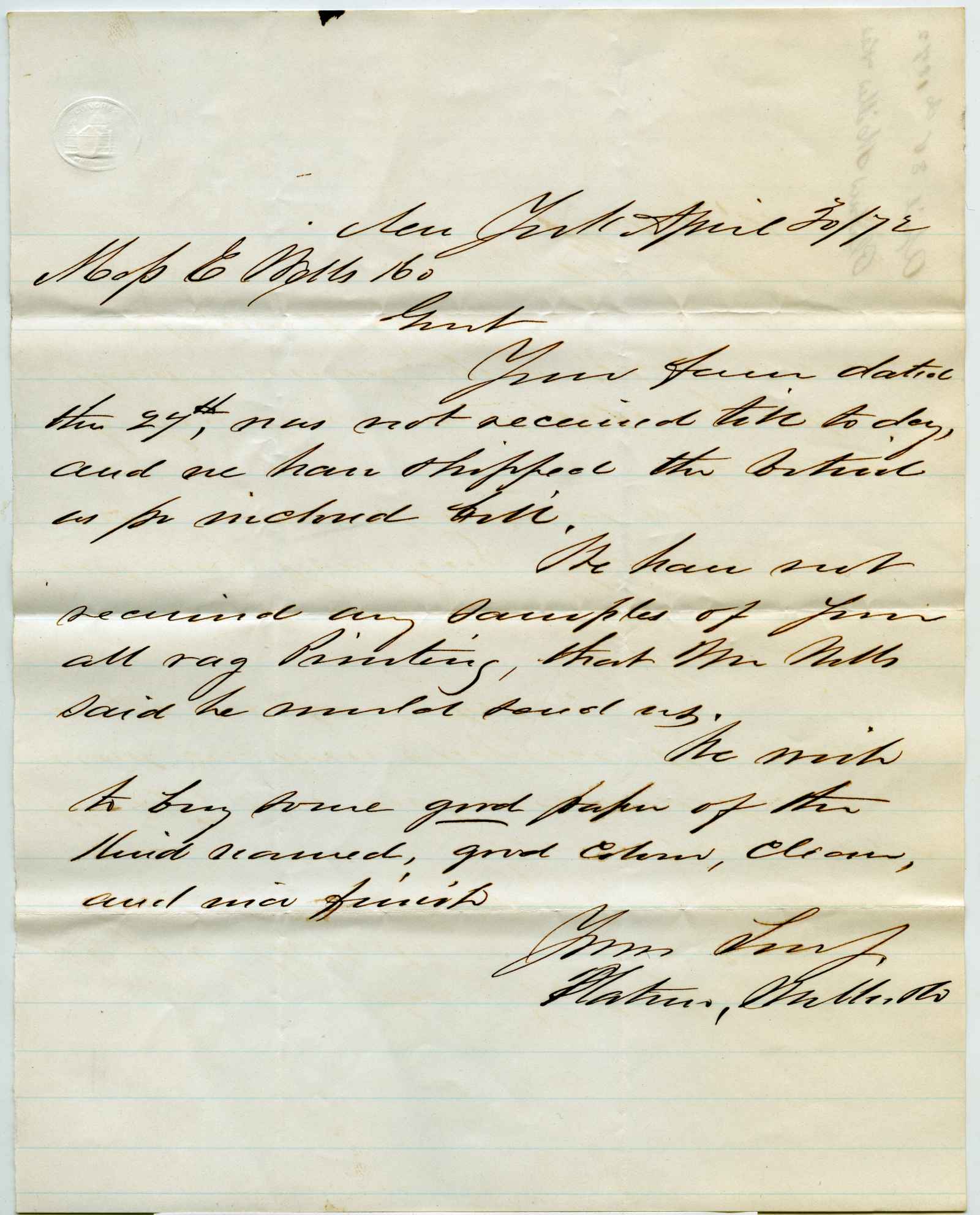 incoming correspondence to the papermaking company of Elisha Wells - circa 1870
