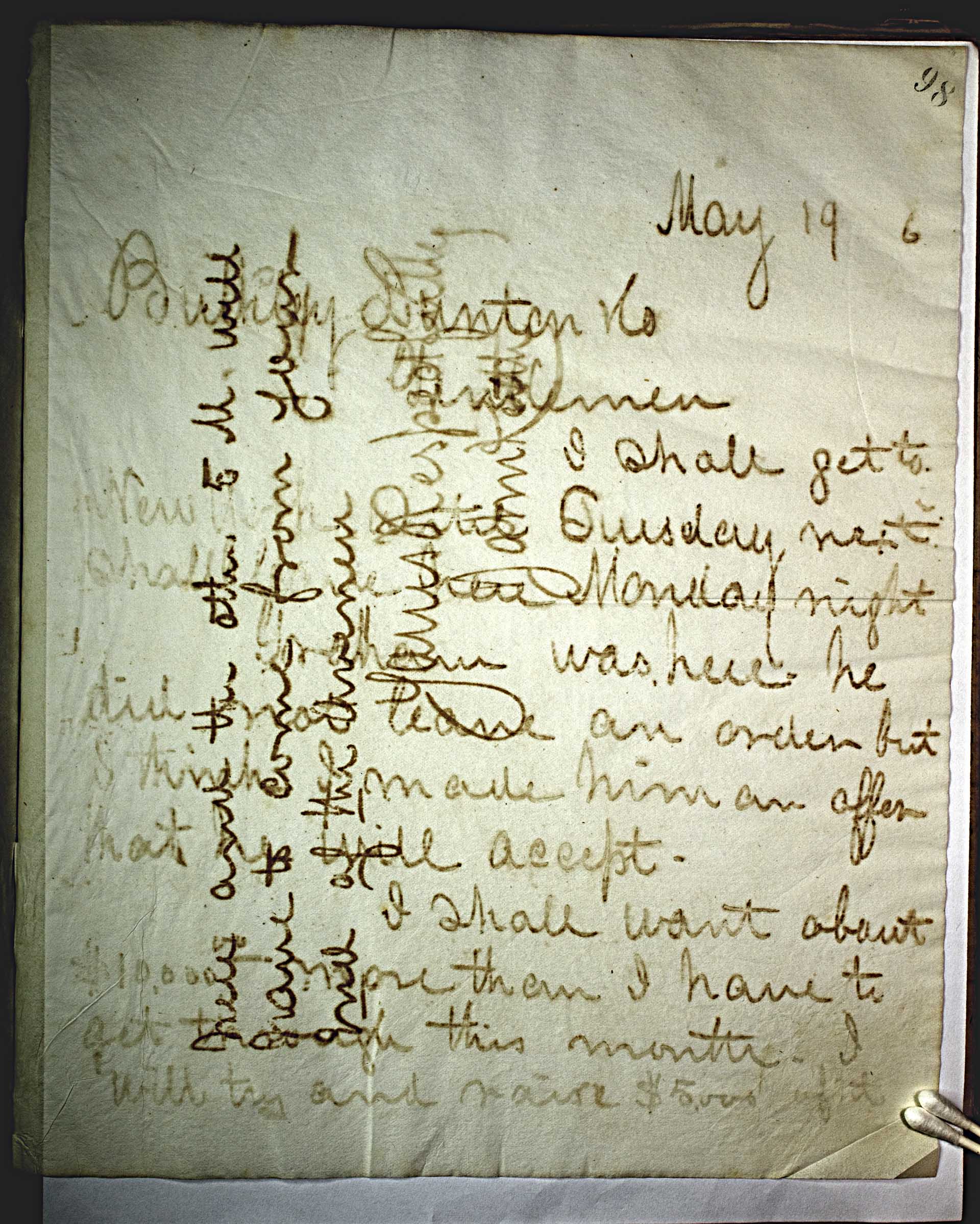 May 19 6 [1876] -- Bulkley Dunton Co. -- Gentlemen, -- I shall get to New York until Tuesday next Shall be here Monday night. -- Goodman was here he did not leave an order but I think I made him an off that he will accept. -- I shall want about $10000.00 -- more than I have to get through this month. I will try and raise $5000 with -- -- Note: -- This letter is partially over-written. A side-bar of darker text – your editor presumes it is a second page of this same letter. -- -- -- [now] and the other 5 [m] will have to come from your end of the avenue. -- Yours Respectfully -- John Keith Prest -- --