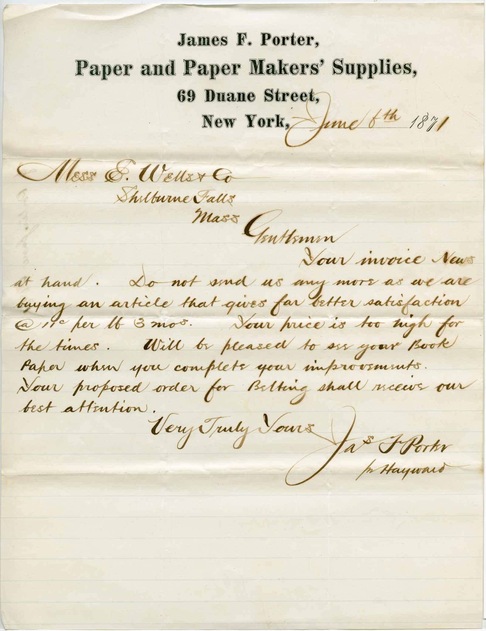 | dc.description.abstract | incoming correspondence to the papermaking company of Elisha Wells - circa 1870 | |