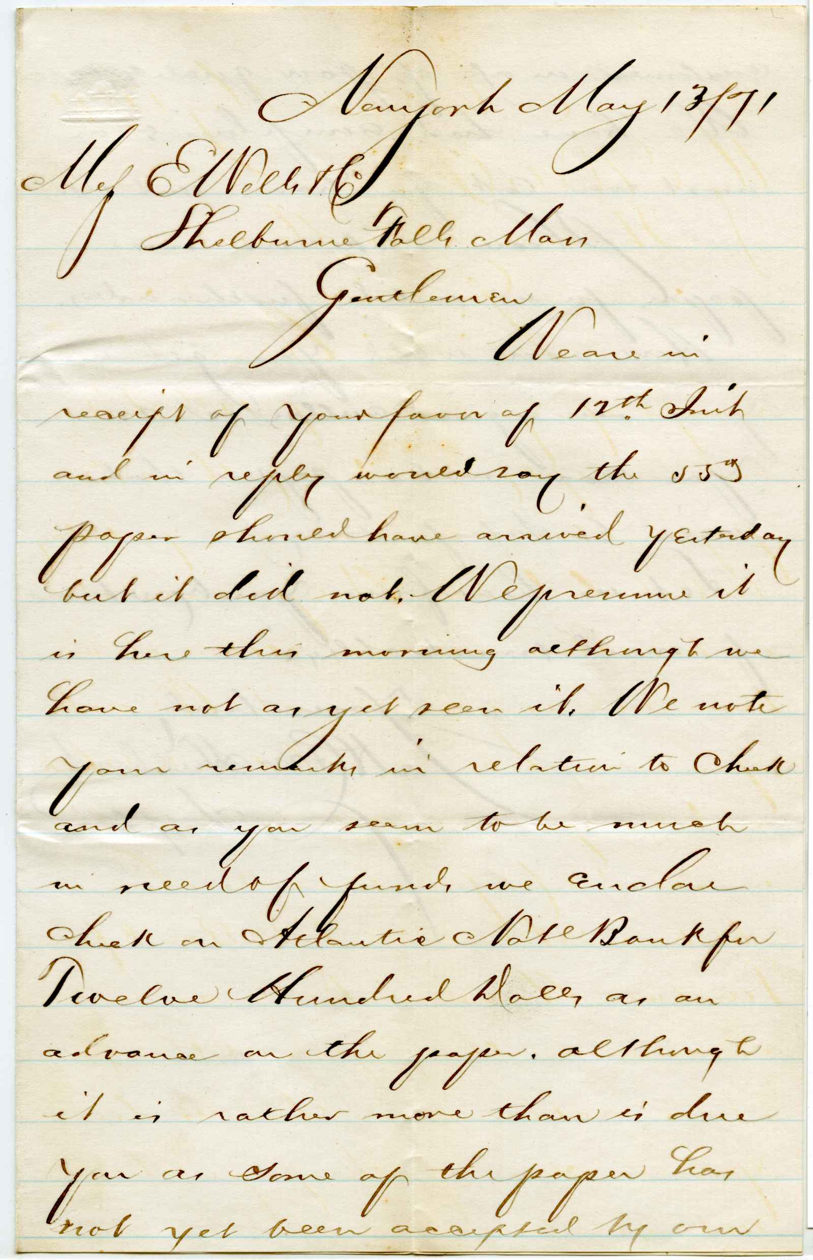 incoming correspondence to the papermaking company of Elisha Wells - circa 1870