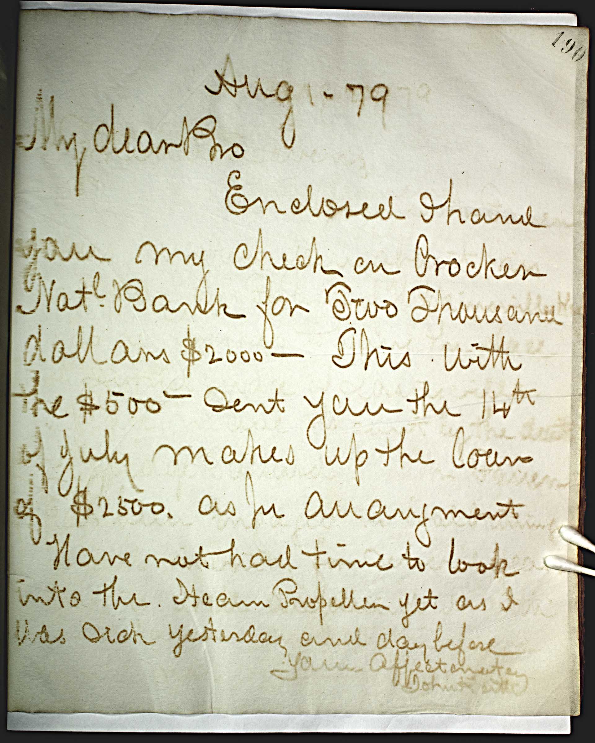 Aug 1 79 [1879] -- My Dear Bro., -- Enclosed I hand you my check on Crocker Natl. Bank for two thousand dollars $2000. This with the $500 sent you the 14th of July make up the loan of $2500. As per arrangement. -- Have not had time to look into the steam propeller yet as I was sick yesterday and day before. -- Yours Affectionately -- John Keith --