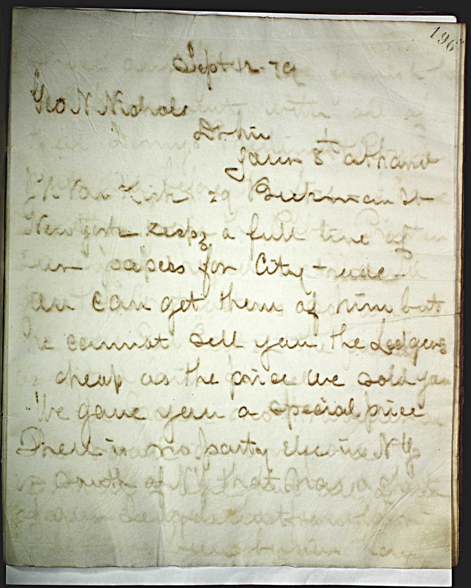 Sept 12 79 [1879] -- Geo. N. Nichols -- Dear Sir, -- Yours 8th at hand. J.H. Van Kirk 29 Burman St. New York uses a full line of our papers for city trade. -- You can get them of him but he cannot sell you the Ledgers as cheap as the price we sold you. -- We gave you a special price There is no party use in NY or south of NY that has a greater [ -- too faded to transcribe -- ] --
