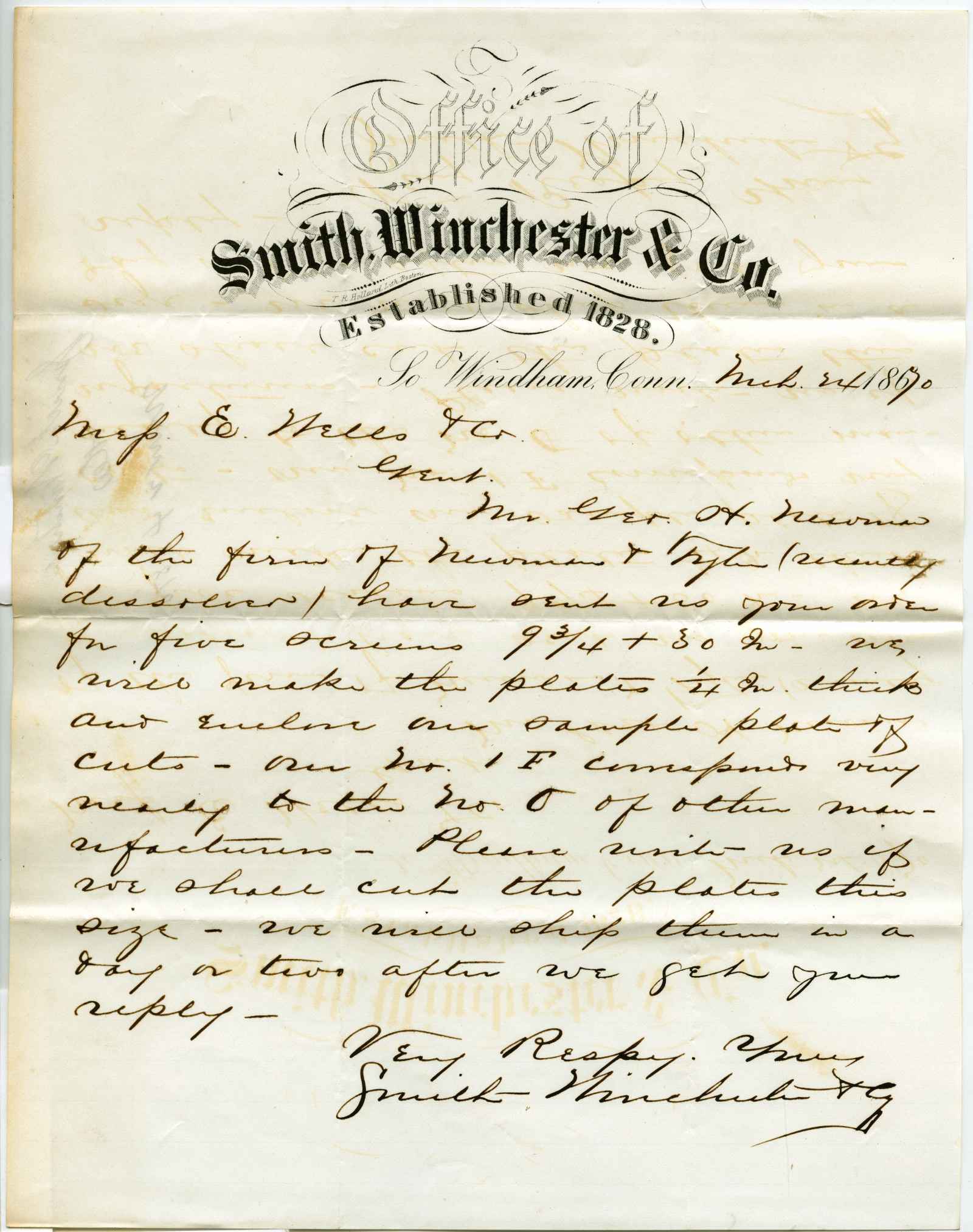 letter; Smith, Winchester & Co. - Screw & Plate Manufacturers - South Windham, Ct.