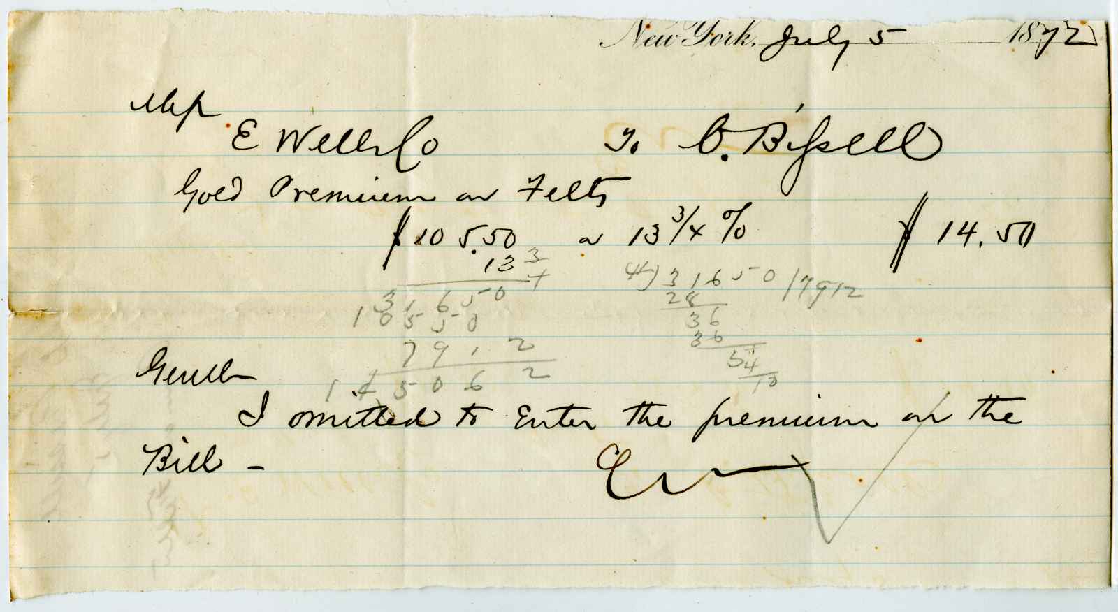 incoming correspondence to the papermaking company of Elisha Wells - circa 1870