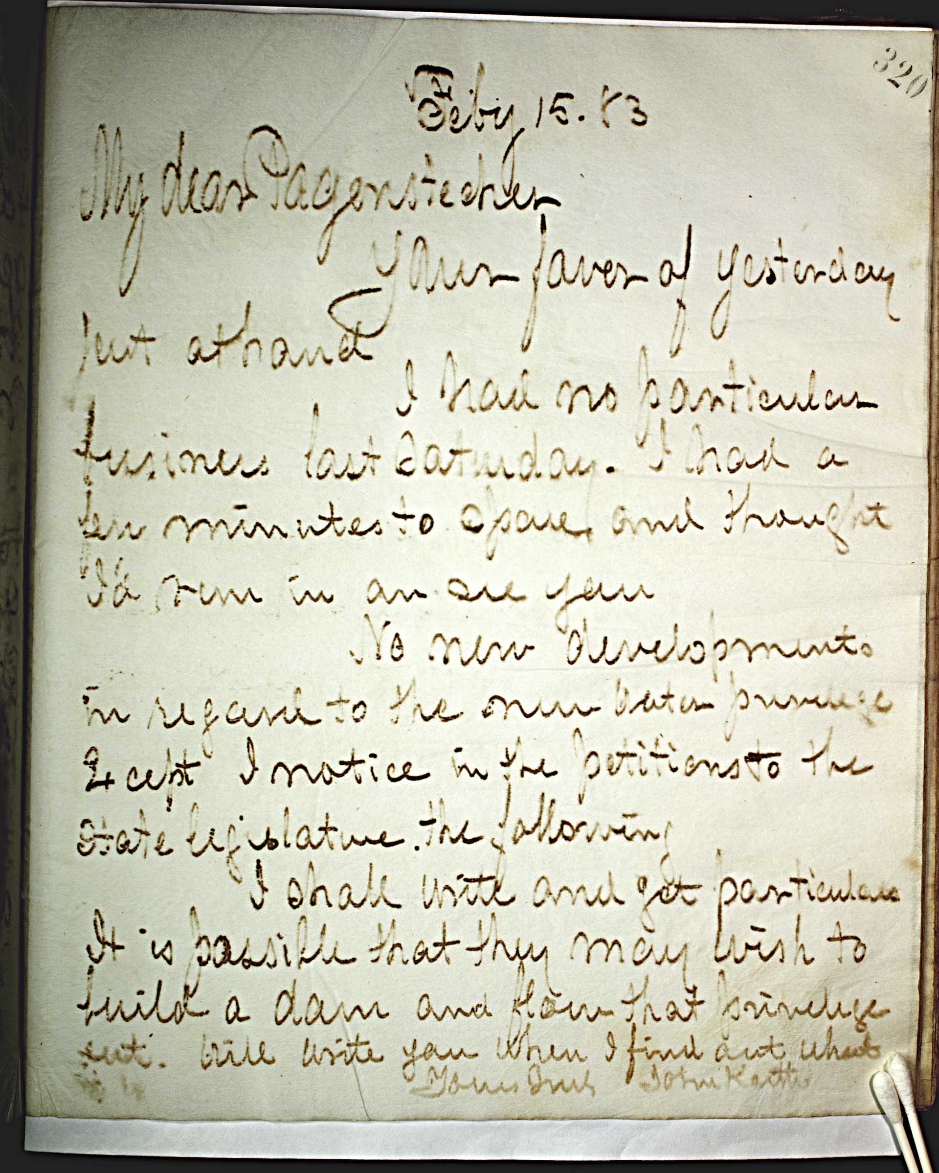Feby 15, 83 [1883] -- My dear Pagenstecher, -- Your favor of yesterday just at hand. -- I had no particular business last Saturday. I had a few minutes to spare and thought id run in and see you. No new developments in regard to the new water privileges except I notice in the petitions to the State legislature the following. -- I shall write and get particulars. It is possible that they may wish to build a dam and flow that privilege out. Will write you when I find out what it is. -- Yours Truly -- John Keith --