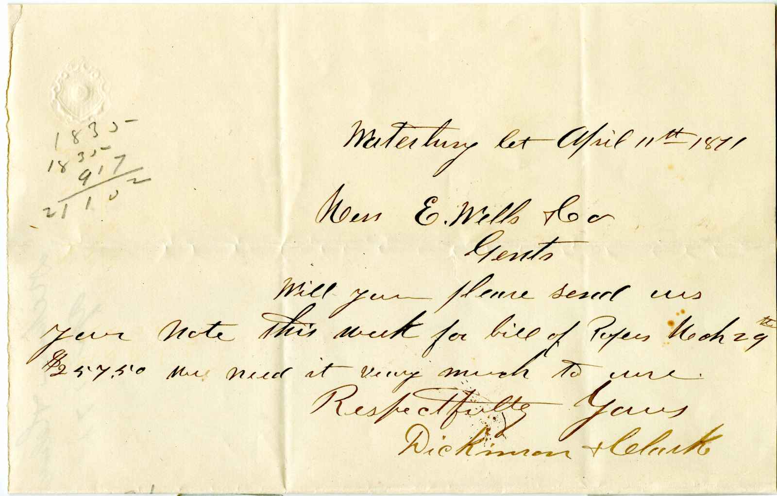 letter; Dickinson & Clark - Paper Sales - Waterbury, Ct.