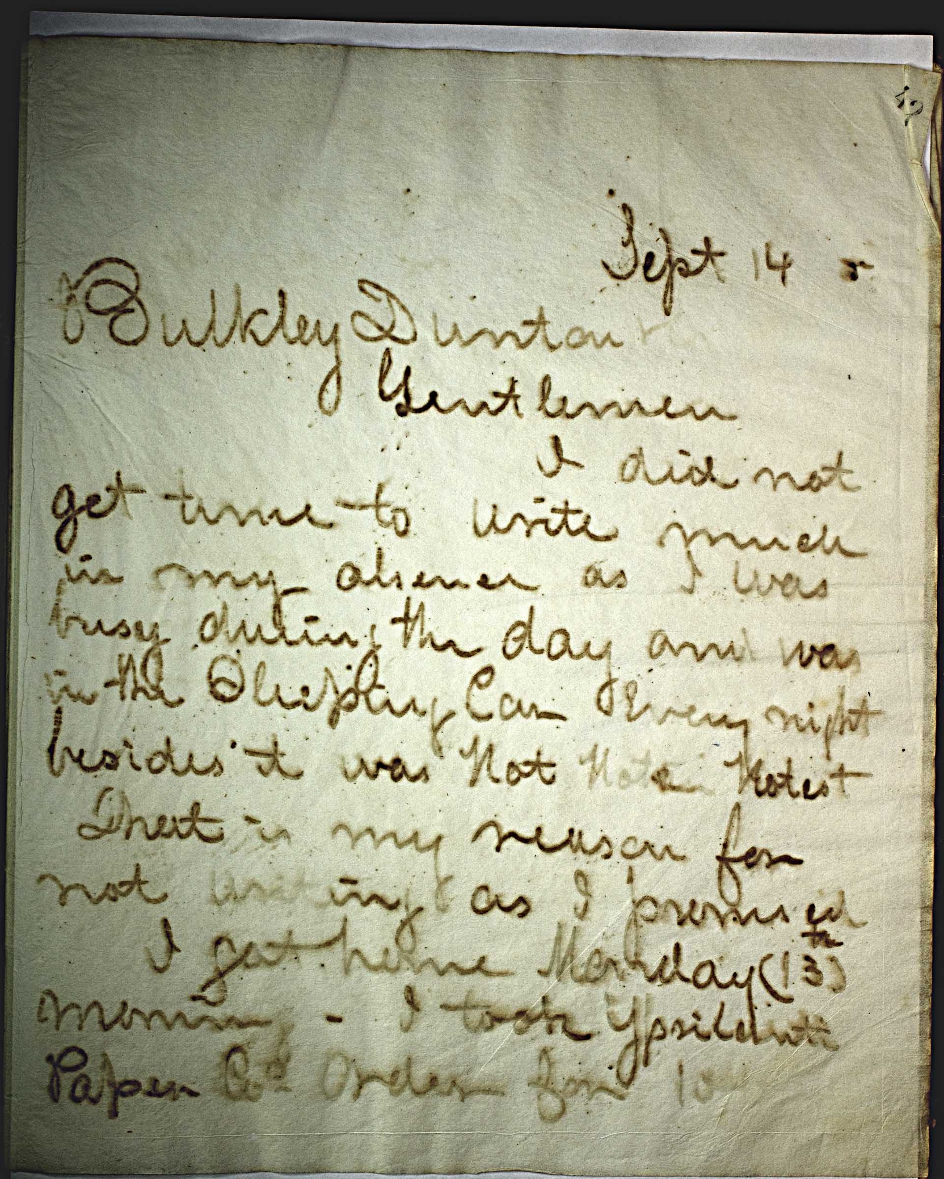Sept 14 5 [1875] -- Buckley Dunton -- Gentlemen -- I did not bet time to write much in my absence as I was busy during the day and was in the sleeping car every night Besides it was hot hoter hotest -- That is my reason for not writing as I promised -- I got home Monday (13) morning - I took Yplsilanti Paper Co order for 10 - --