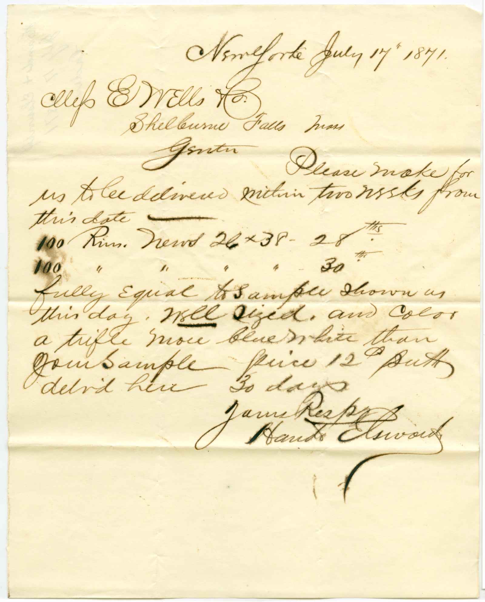 incoming correspondence to the papermaking company of Elisha Wells - circa 1870
