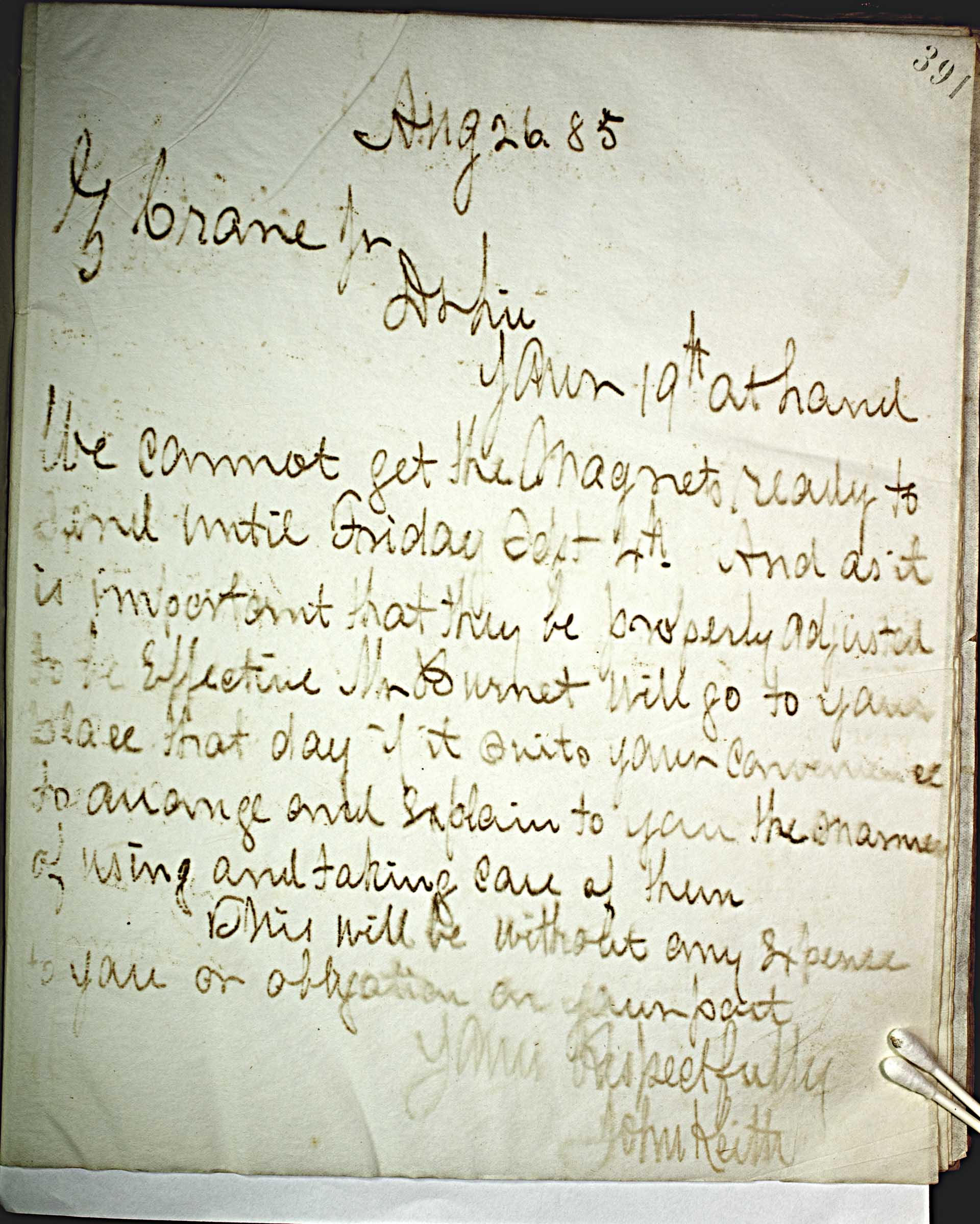 Aug. 26, 5 [1885] -- -- G. Crane Jr. -- Dr Sir, -- Your 19th at hand. -- We cannot get the magnets ready to send until Friday Sept 4th . And as it is important that they be properly adjusted to be effective. Mr Burnett will go to your place that day if it suits your convenience to arrange and explain to you the [?] of using and taking care of them. -- This will be without any expense to you or obligation on your part. -- Yours Respectfully -- John Keith --
