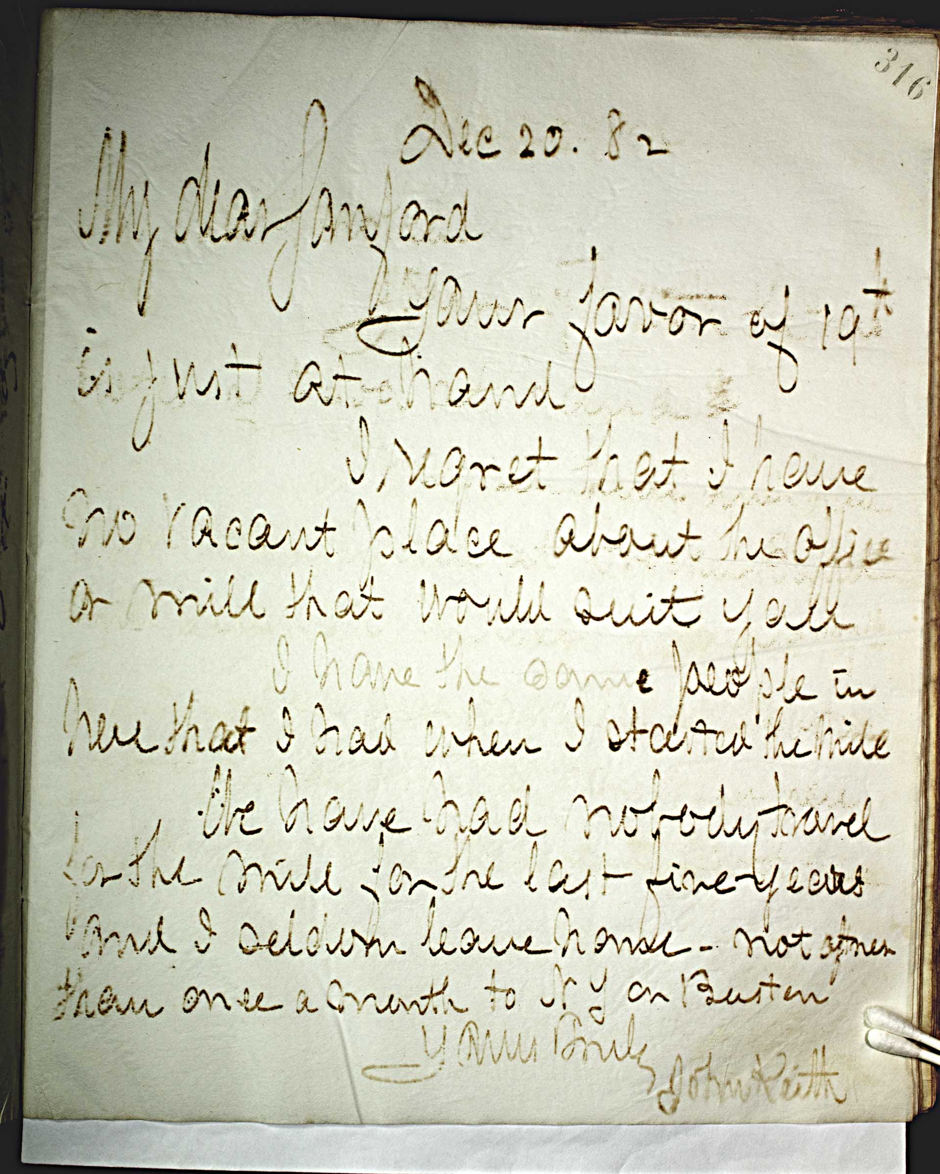 Dec 20, 82 [1882] -- My dear Lanford, -- Your favor of 19th is just at hand. -- I regret that I have no vacant place about the office or mill that would suit you. -- I have the same people in here that I had when I started the mill. -- We have had nobody travel for the mill for the last five years and I seldom leave home- not oftener than once a month to N.Y. or Boston. -- Yours Truly -- John Keith --