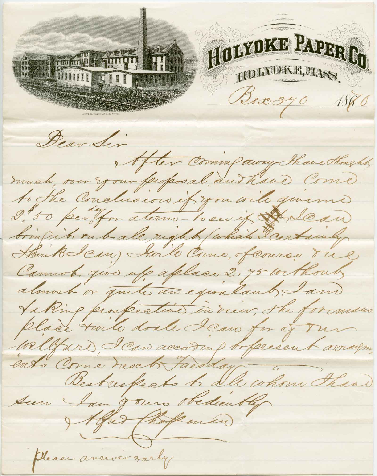 letter; Holyoke Paper Co. - Shafting, Gearing and Mill Work - Holyoke, Ma.