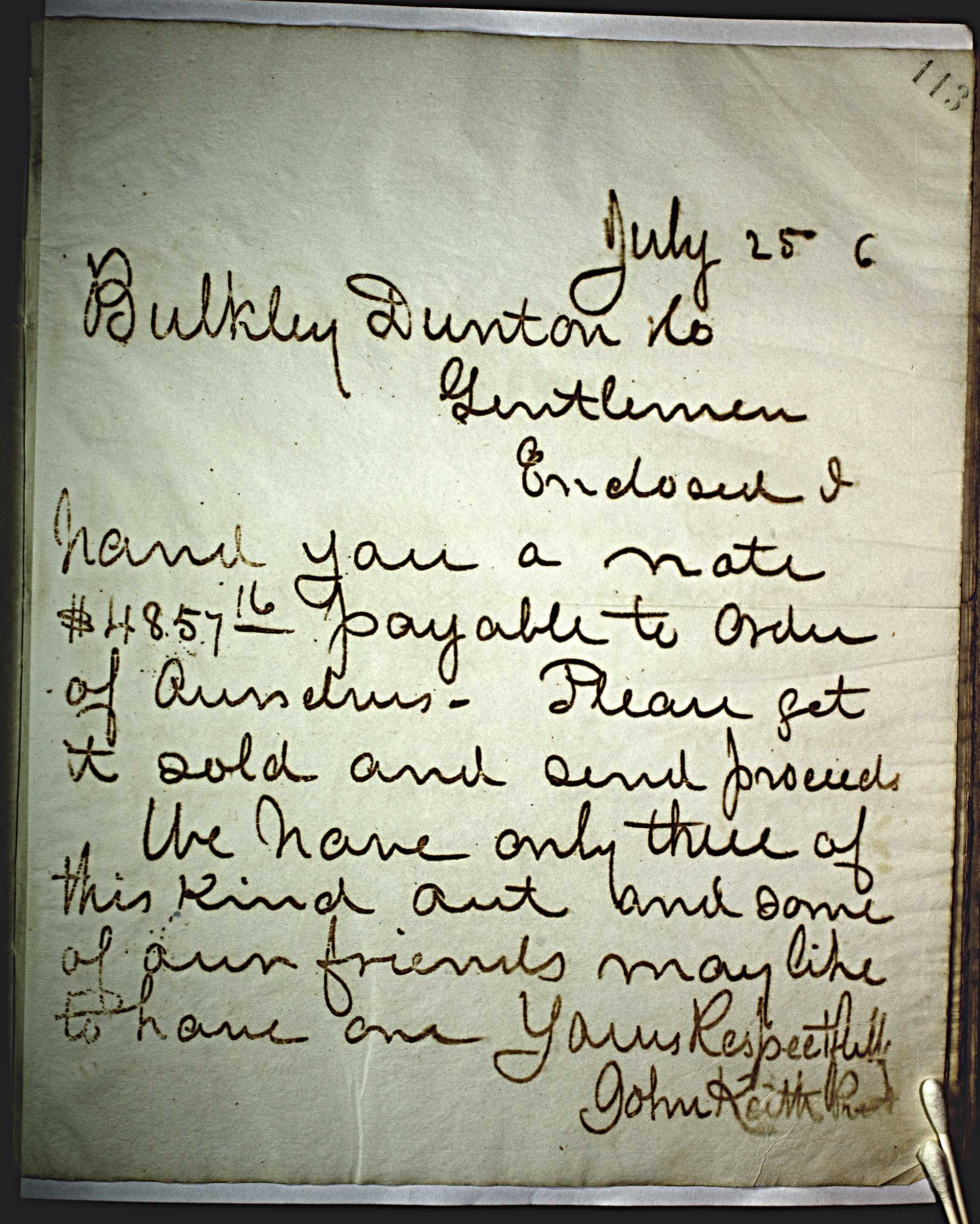 July 25 6 [1876] -- Bulkley Dunton Co. -- Gentlemen, -- Endorsed I hand you a note $4857 -- 16 -- payable to order of Aundrus. Please get it sold and send proceeds. -- We have only three of this kind out and some of our friends may like to have one. -- Yours Respectfully -- John Keith Prest --