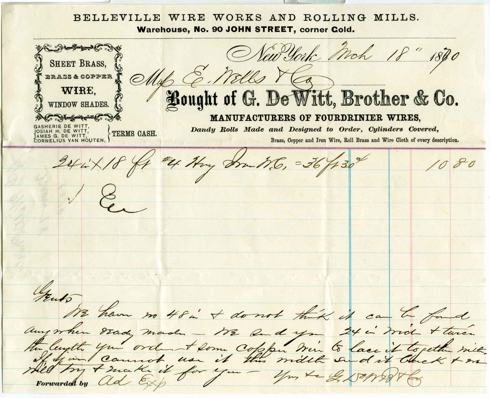 invoice; DeWitt, G., Brother & Co. - Manufacturers of Fourdrinier Wires - N.Y.