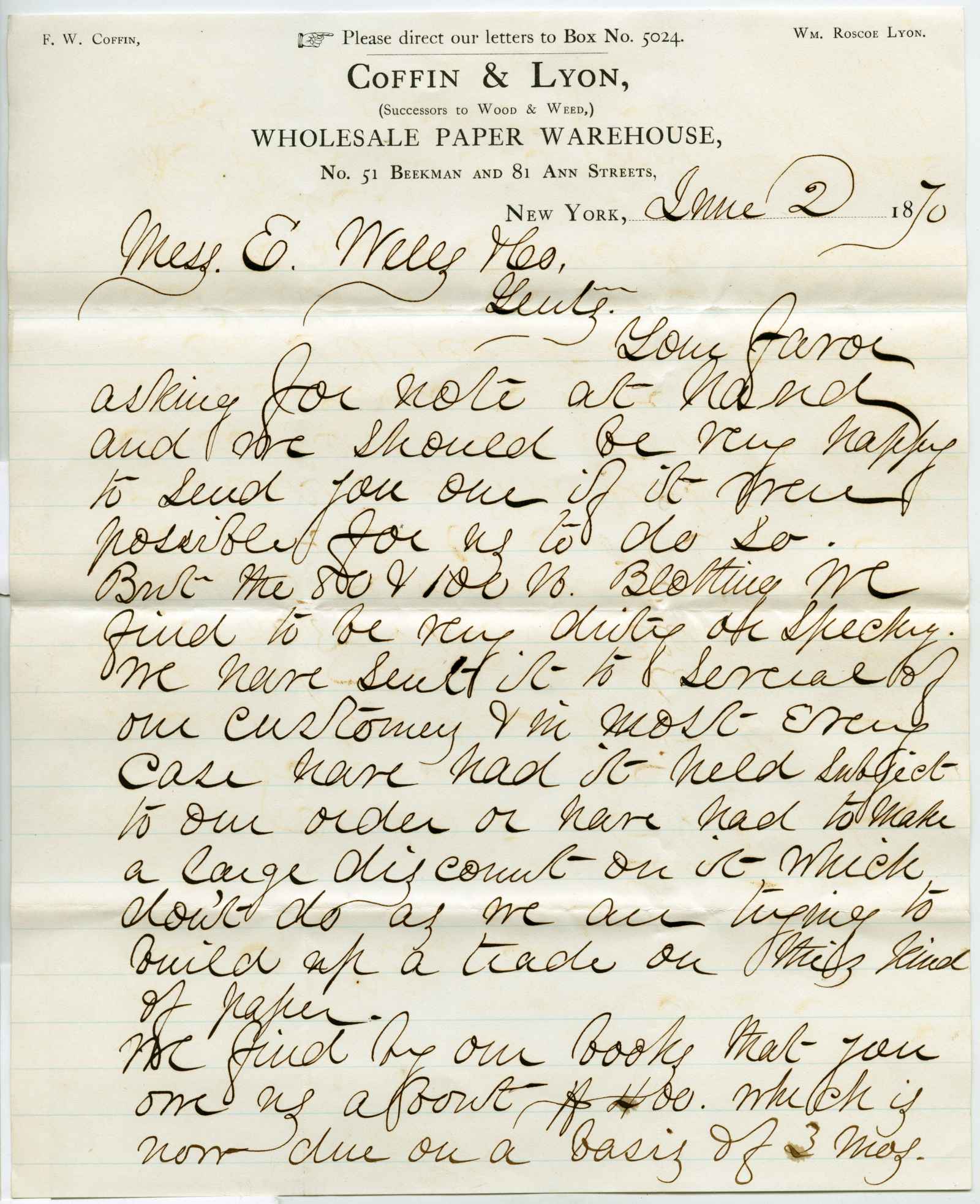 incoming correspondence to the papermaking company of Elisha Wells - circa 1870