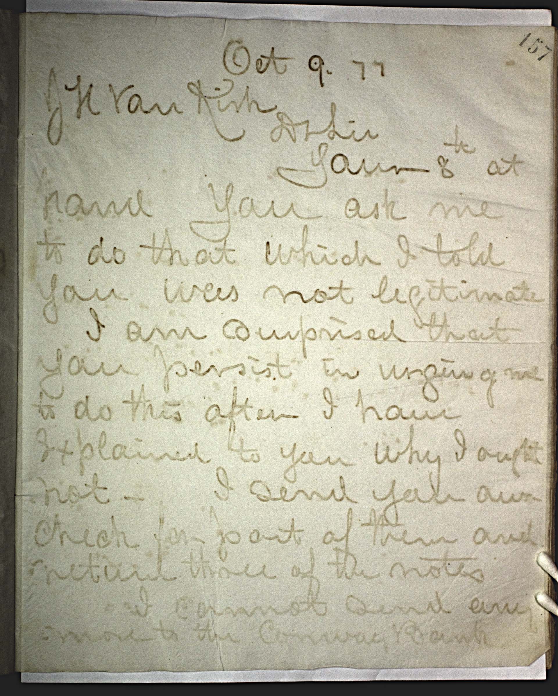 Oct 9 7 [1877] -- J. H. Van Kirk -- Dr Sir, -- Your 8th at hand You ask me to do that which I told you was not legitimate. -- I am surprised that you persist in urging of me to do this after I have explained to you why I ought not. I send you our check for part of them and retired three of the notes. -- I cannot send any more to the Conway Bank --