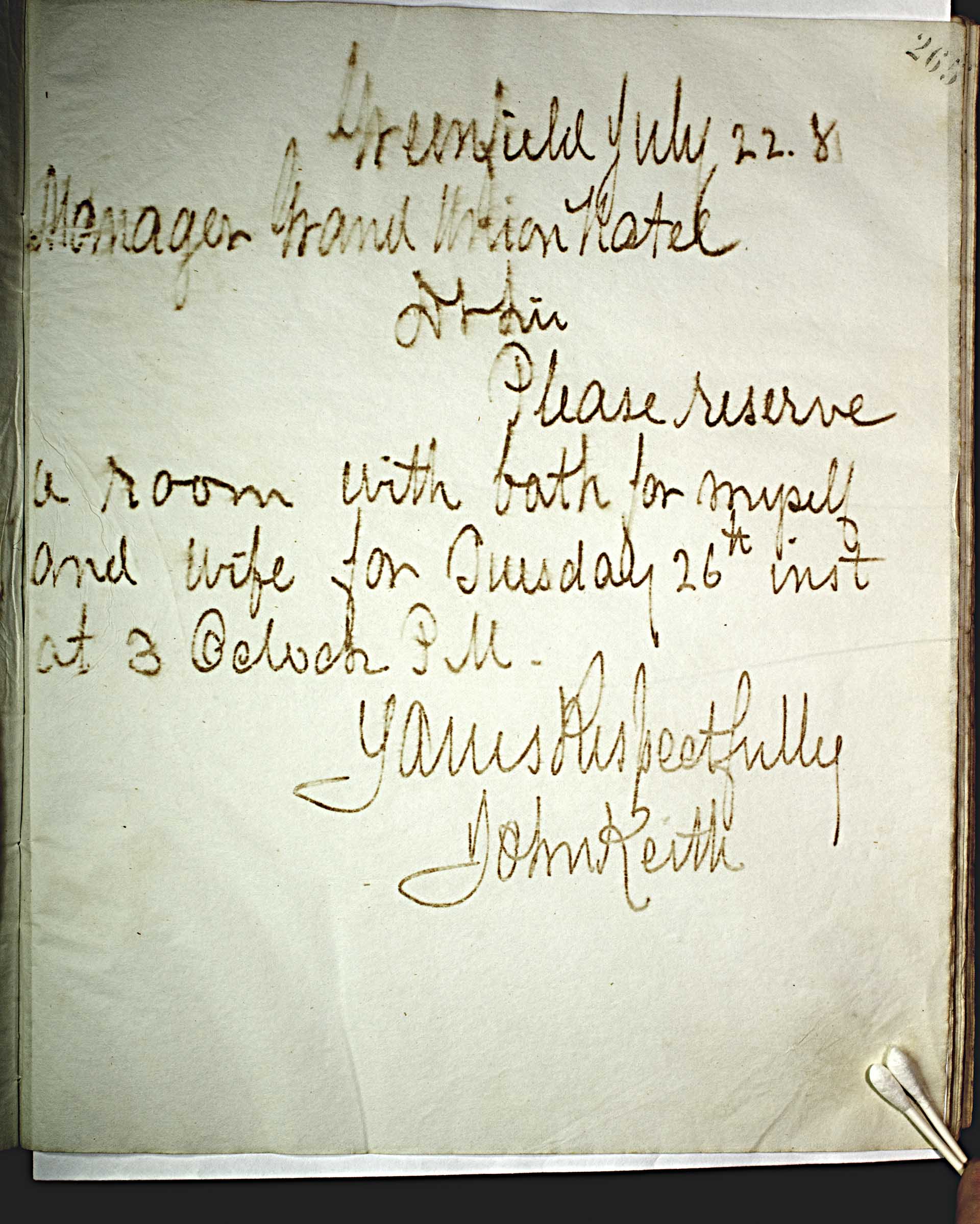 Greenfield July 22, 81 [1881] -- Manager Grand Union Hotel -- Dr Sir, -- Please reserve a room with bath for myself and wife for Tuesday 26th inst. at 3 O'clock P.M. -- Yours Respectfully -- John Keith -- ; -- inst. An infinitesimal or very short space of time; a moment.