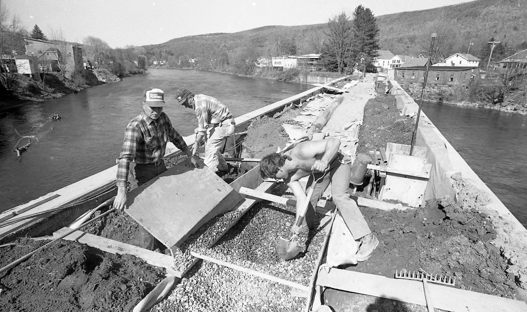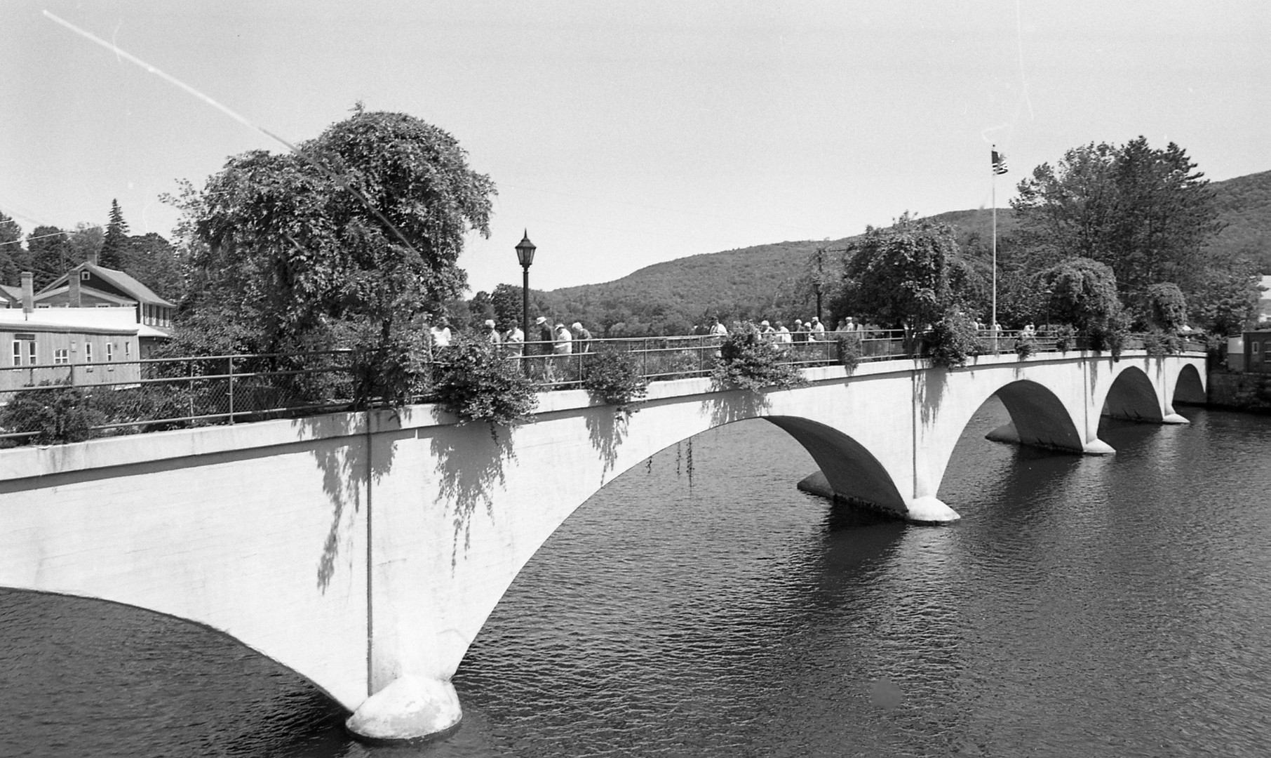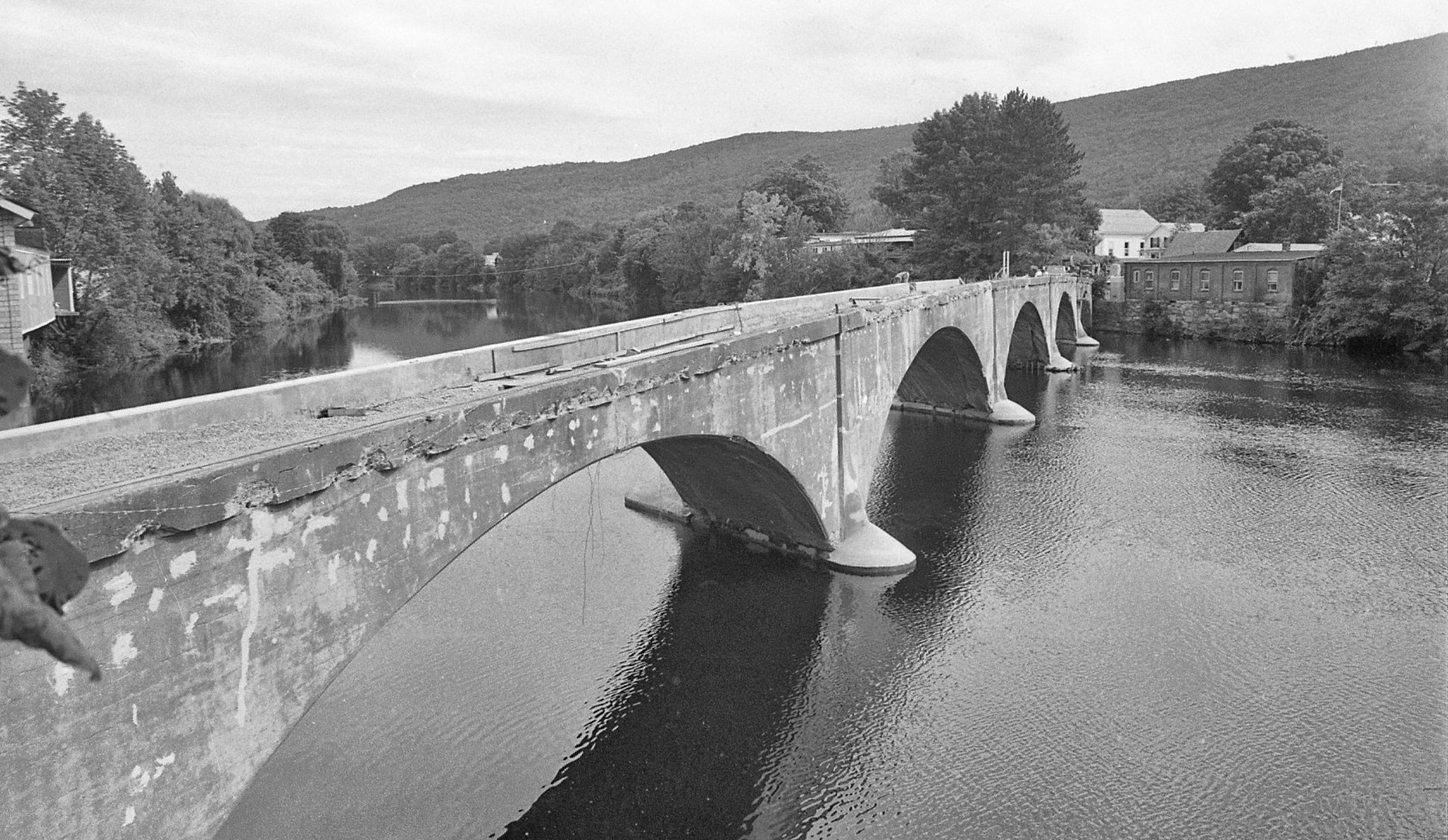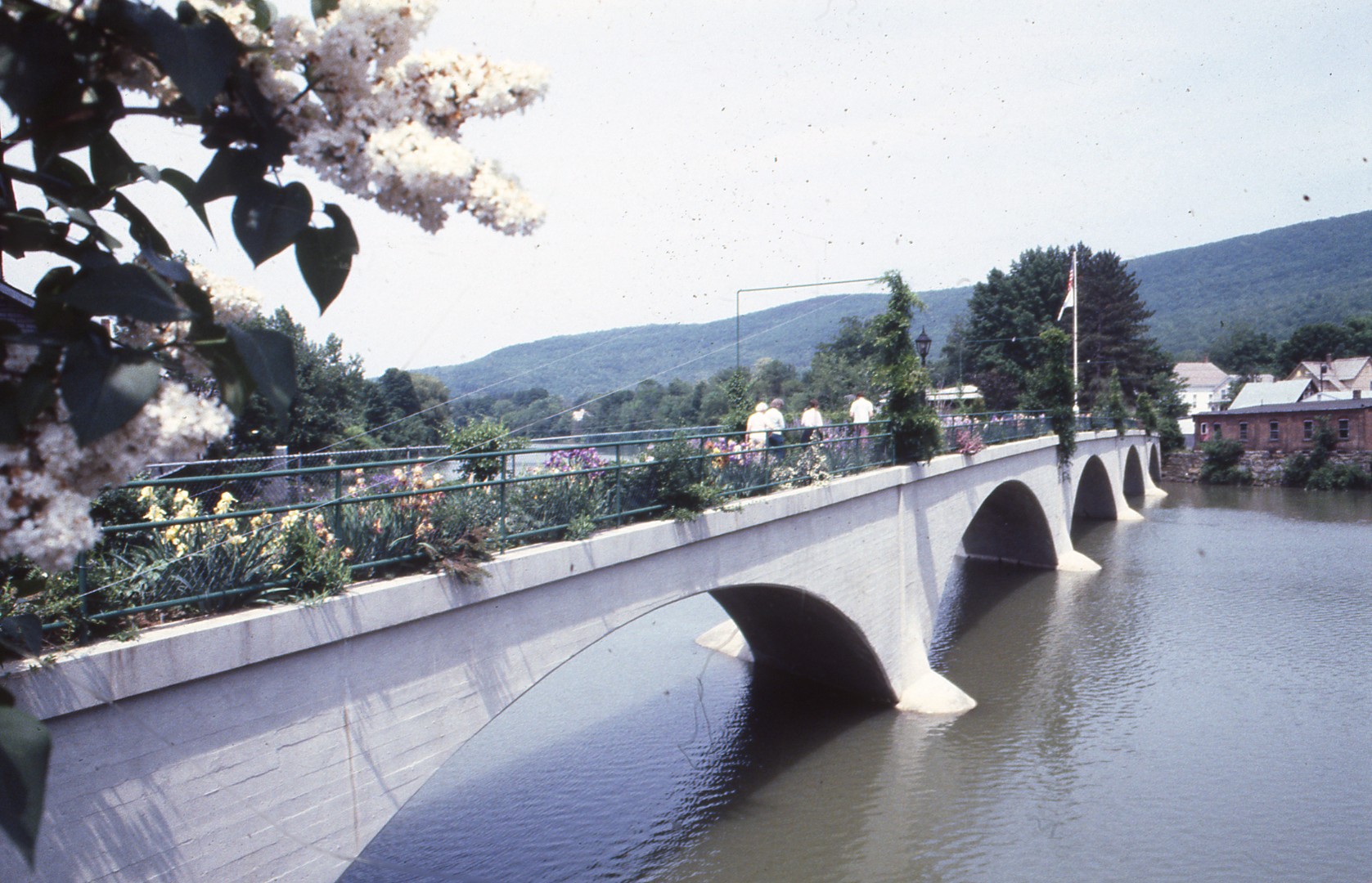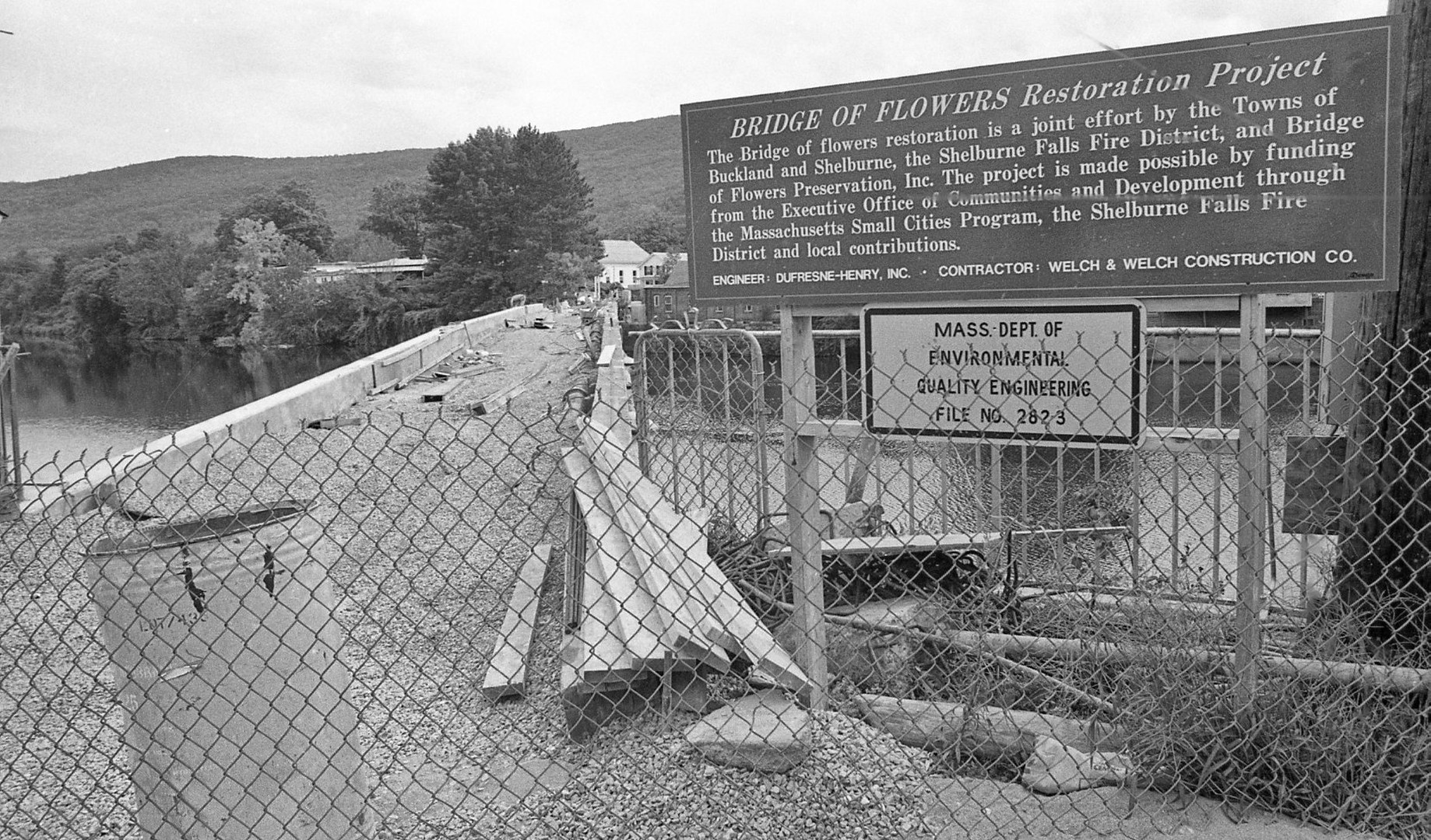 In 1975, a photographic study was conducted of Shelburne Falls. One of the concerns of the town was the deterioration of the bridge structure. In 1981, funds were raised by those who owned the bridge, and a study was commissioned. The study determined that $580,000 in repairs should be made to the bridge. Various organizations raised money and repairs began on May 2, 1983. During the restoration, every plant that was removed was cared for in private. The restoration replaced the 8-inch water line, which carries up to half a million gallons of water a day. The bridge also contains two and a half feet of soil at the top of the arches and nine feet deep at the piers. On August 28, 2011, rain runoff from Hurricane Irene (at that point a tropical storm) flooded the Deerfield River and engulfed the Bridge of Flowers. Source: Wikipedia