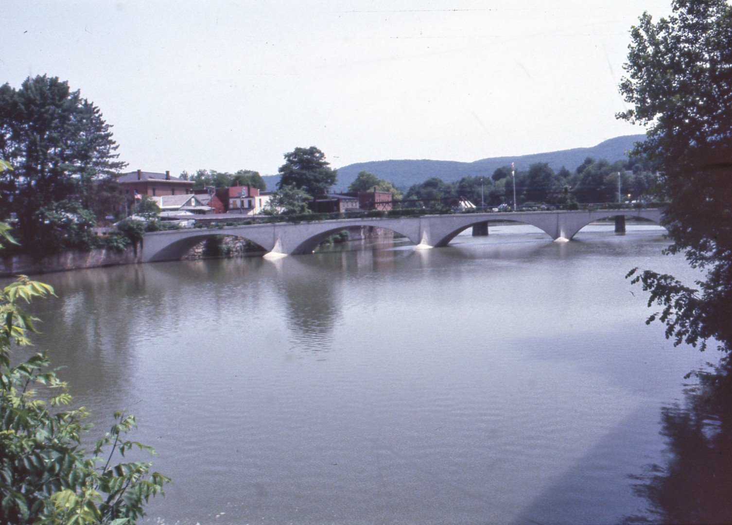Built for $20,000 in 1908 by the Shelburne Falls and Colrain Street Railway so that freight could be picked up and dropped off directly from the railroads and brought to Colrain. This concrete bridge was necessary because the nearby Iron Bridge had a twenty-ton weight limit. The Iron Bridge – a truss bridge built in 1890 – is still open to vehicles. The two bridges' ends in Buckland are almost side by side. As automobile usage began to increase, freight began to be transported more by trucks, and the street railway (trolley) company went bankrupt in 1927. The history of the railway is preserved in the Shelburne Falls Trolley Museum