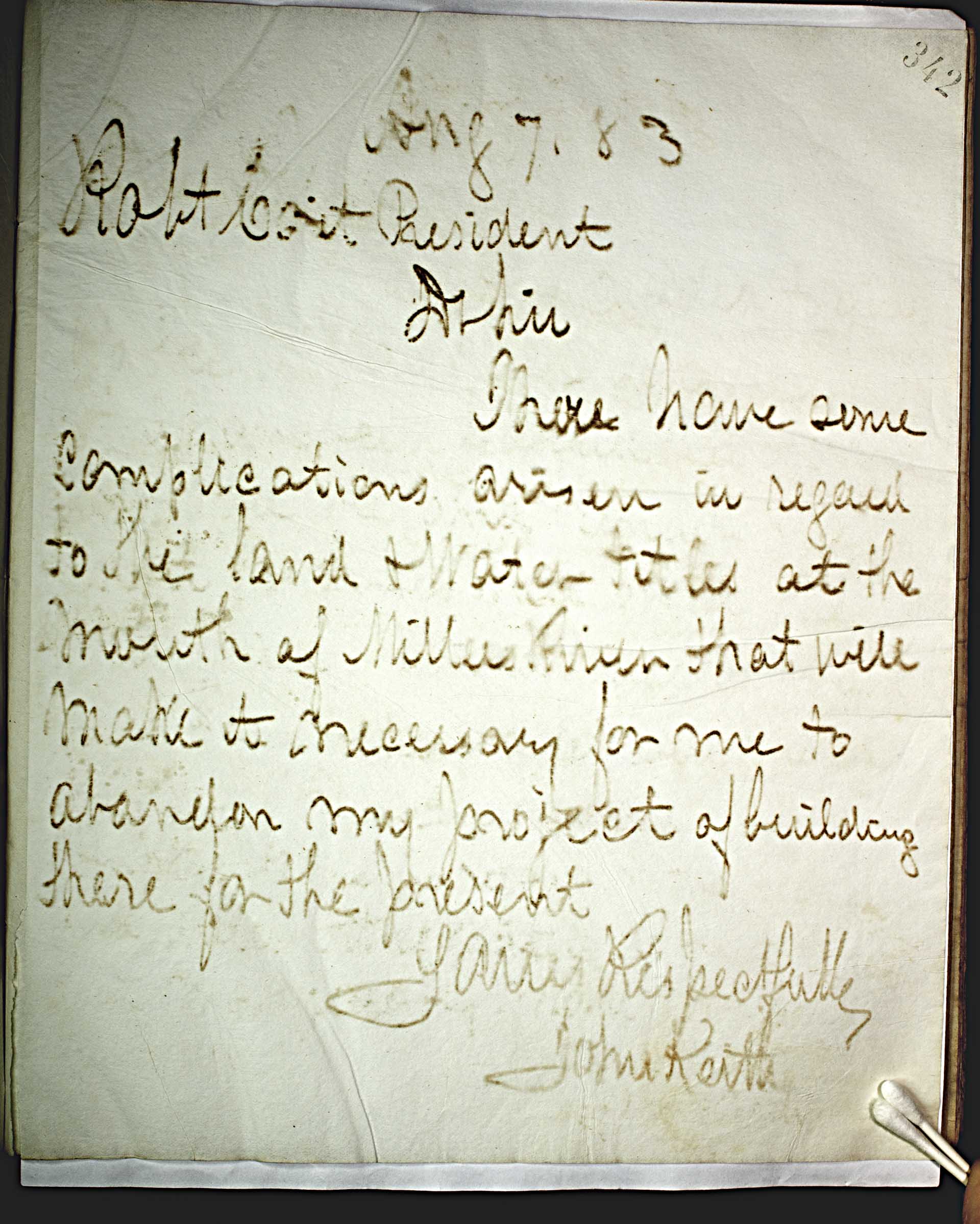 | dc.description | Aug 7, 83 [1883] -- Robt. Coit President -- Dr Sir, -- There have some complications arisen in regard to the land & water titles at the mouth of Millers River that will make it necessary for me to abandon my project of building there for the present. -- Yours Respectfully -- John Keith -- | |