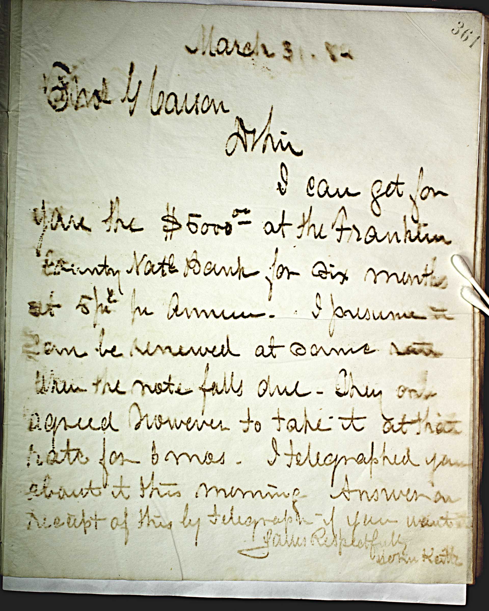 March 31, 84 [1884] -- Chas. G. Carson -- Dr Sir, -- I can get for you the $5000.00 -- at the Franklin County Nat -- l -- bank for six months at 5 -- prc -- per annum. I presume it can be renewed at same rate when the note falls due. They only agreed however to take it at that rate for 6 mos. I telegraphed you about it this morning. Answer on receipt of this by telegraph if you want to. -- Yours Respectfully -- John Keith --