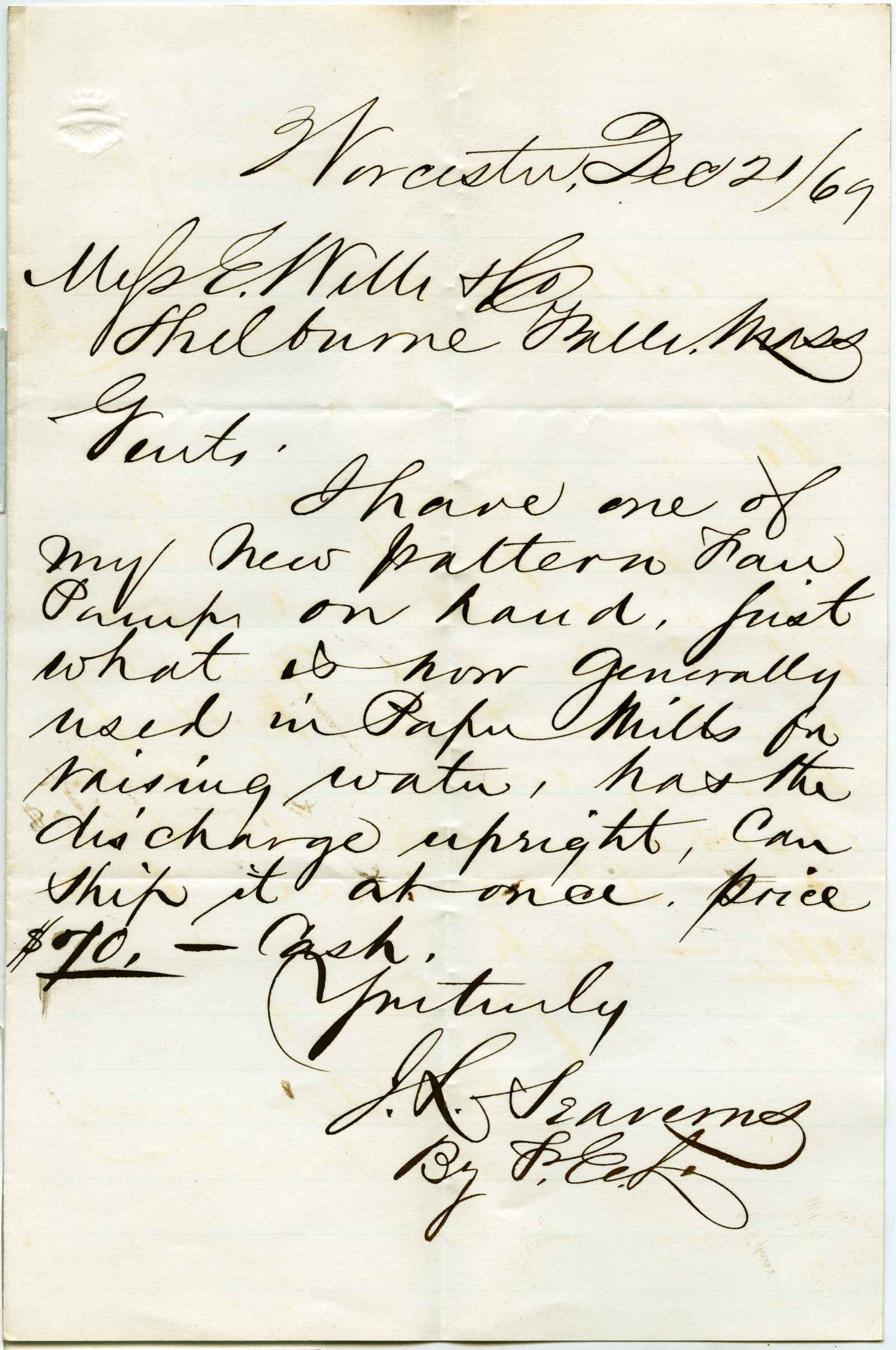 letter; Severance, J. L. - Fan Pumps - Worcester, Ma.