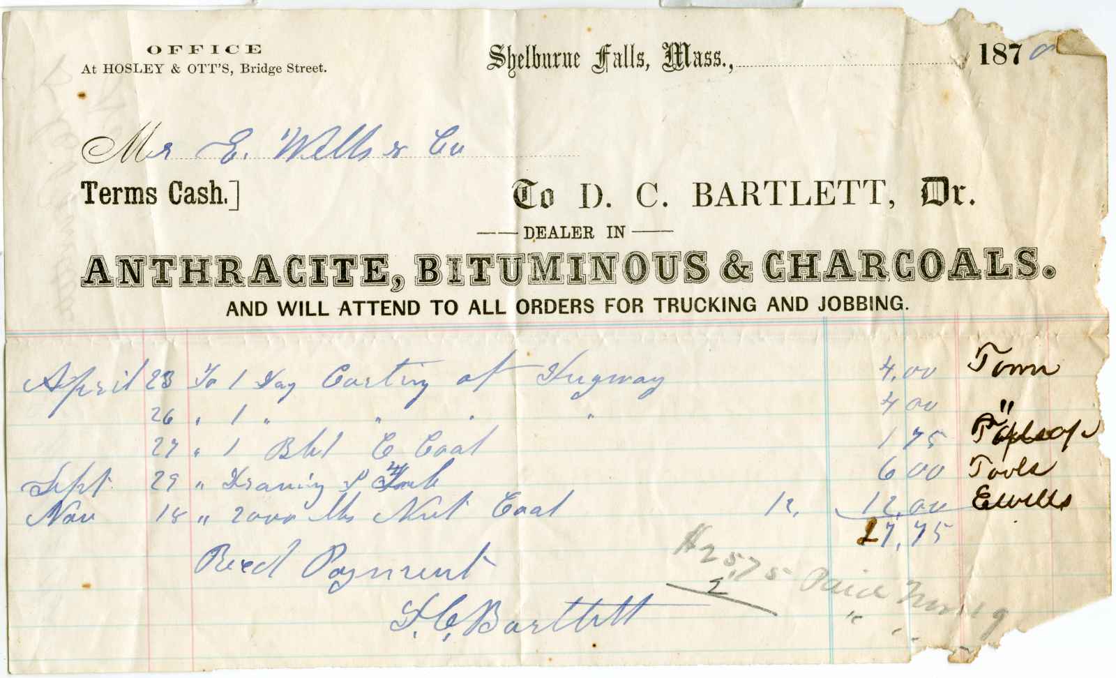 invoice; Bartlett, D. C. - Anthracite, Bituminous & Charcoals - Shelburne Falls, MA