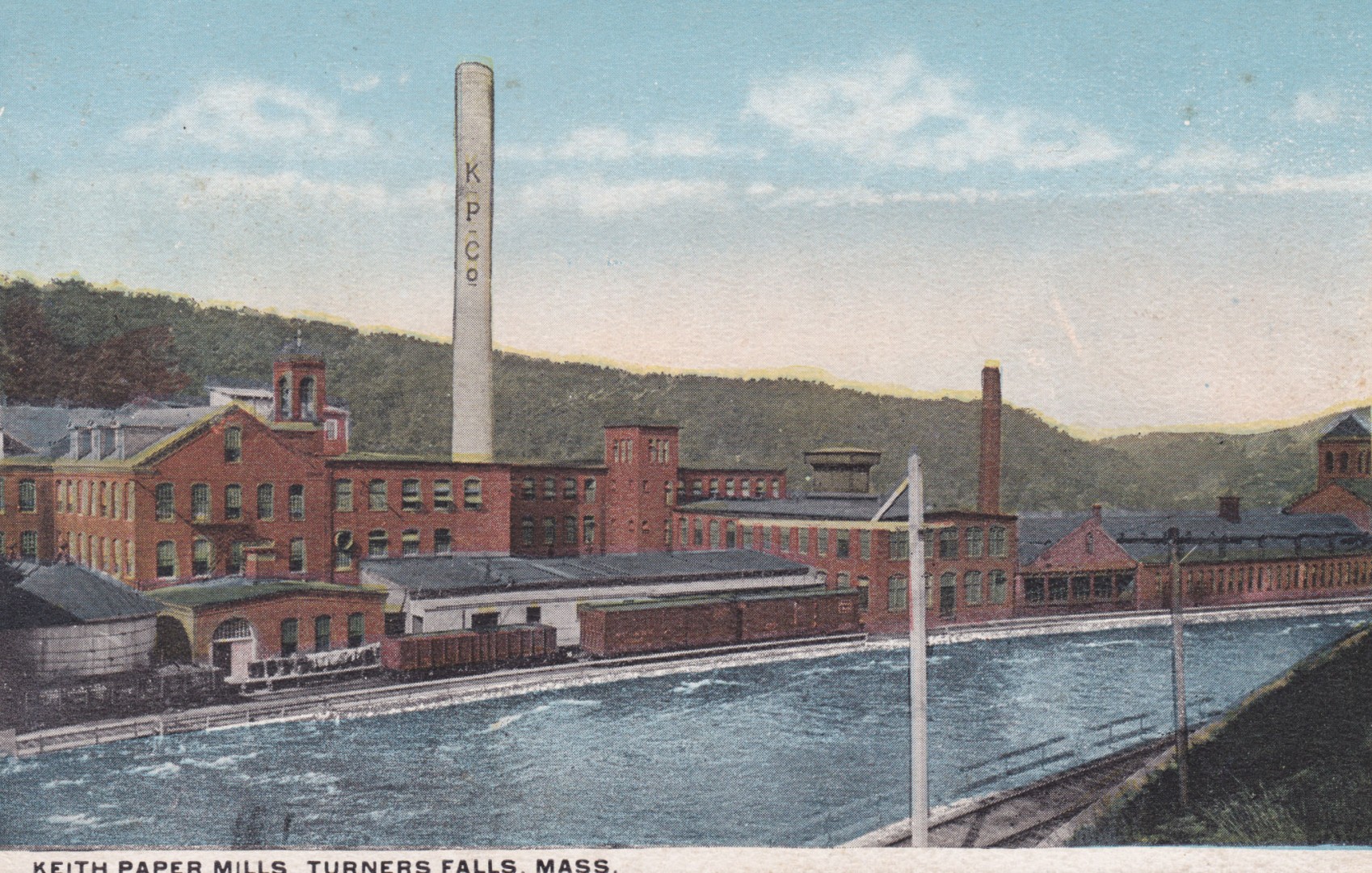 - Lookin' northeast from the Lower or "White" Suspension Bridge (1872-1936) that crosses the Connecticut River and stitches the Town of Greenfield to the village of Turners Falls, in the Town of Montague, MA. We see the west exposure of two paper mills. The further one is the Keith Paper mill (1871-1953) and the one forward is the Esleeck Manufacturing Company (1900-2006). -Post mark 1914.