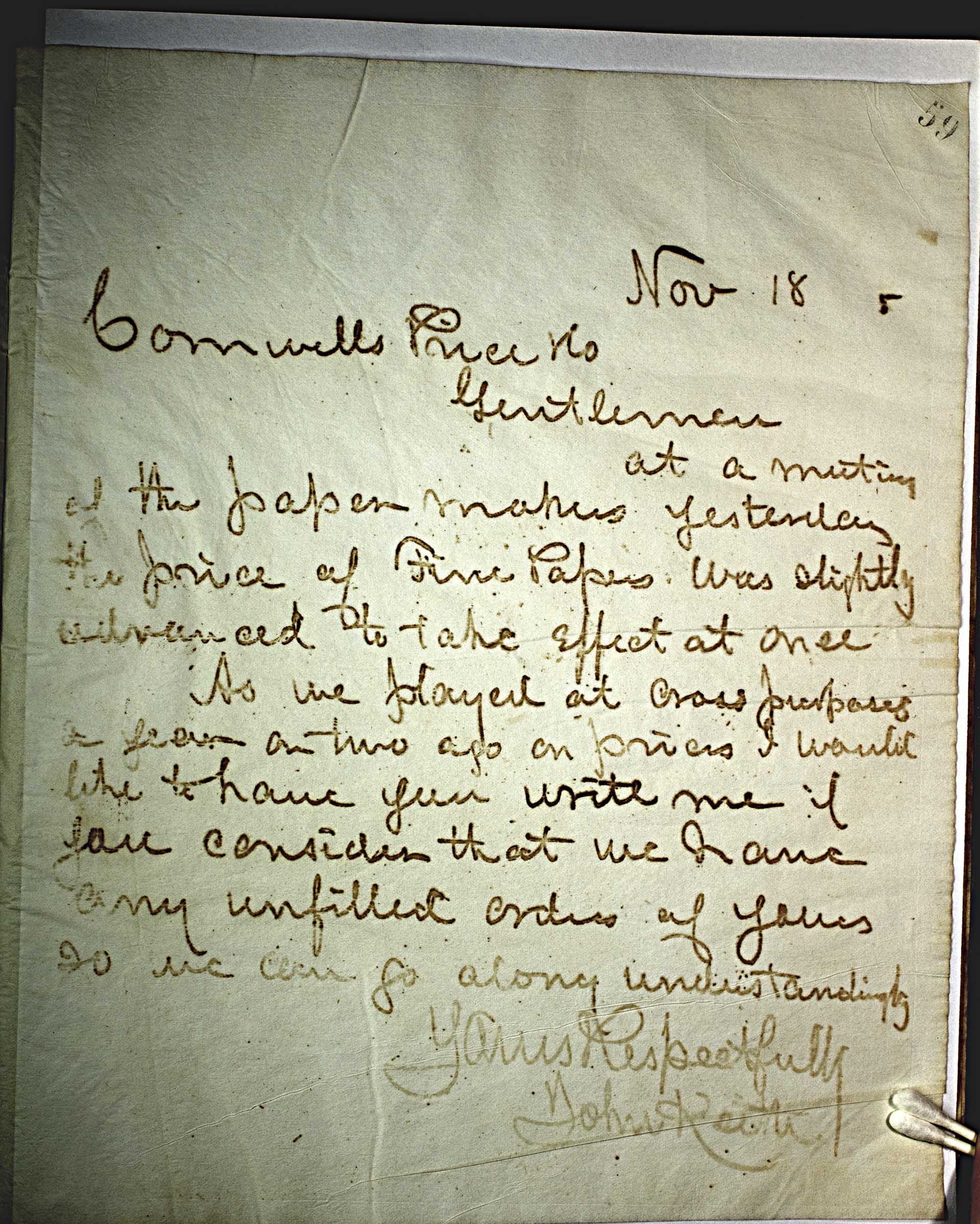 Nov 18 5 [1875] -- Cornwells Price Co -- Gentlemen -- At a meeting of the paper makers yesterday the price of Fine Papers was slightly advanced to take effect at once. -- As we played at cross proposing a year or two ago on prices I would like to have you consider write me if you consider that we have any unfilled orders of yours so we can go along understandingly -- Yours Respectfully -- John Keith --