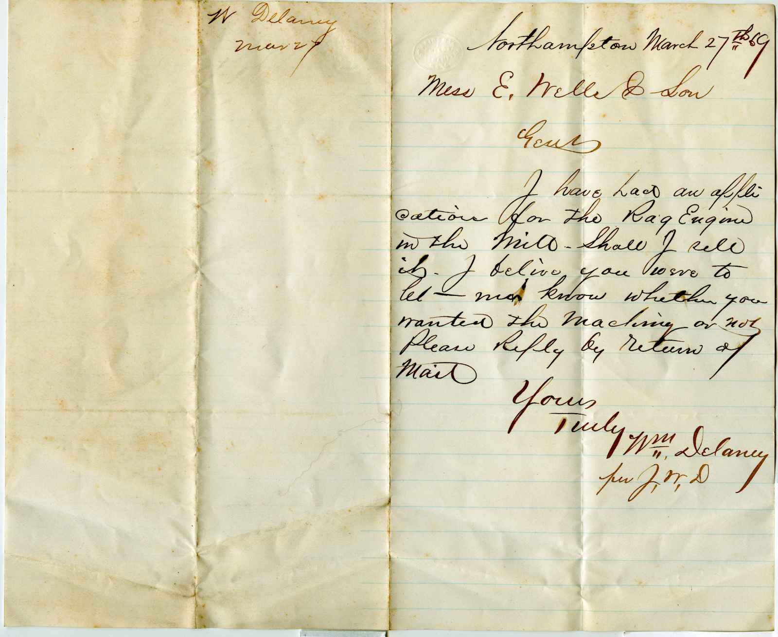 letter; Delaney, William - Machinery Sales - Northampton, Ma.