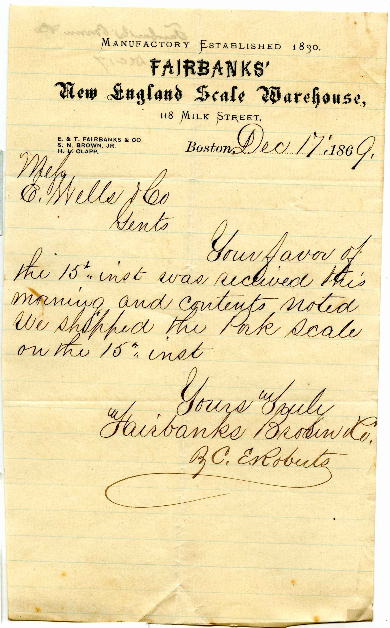 letter; Fairbanks Scale Warehouse - Scale Rental - Boston