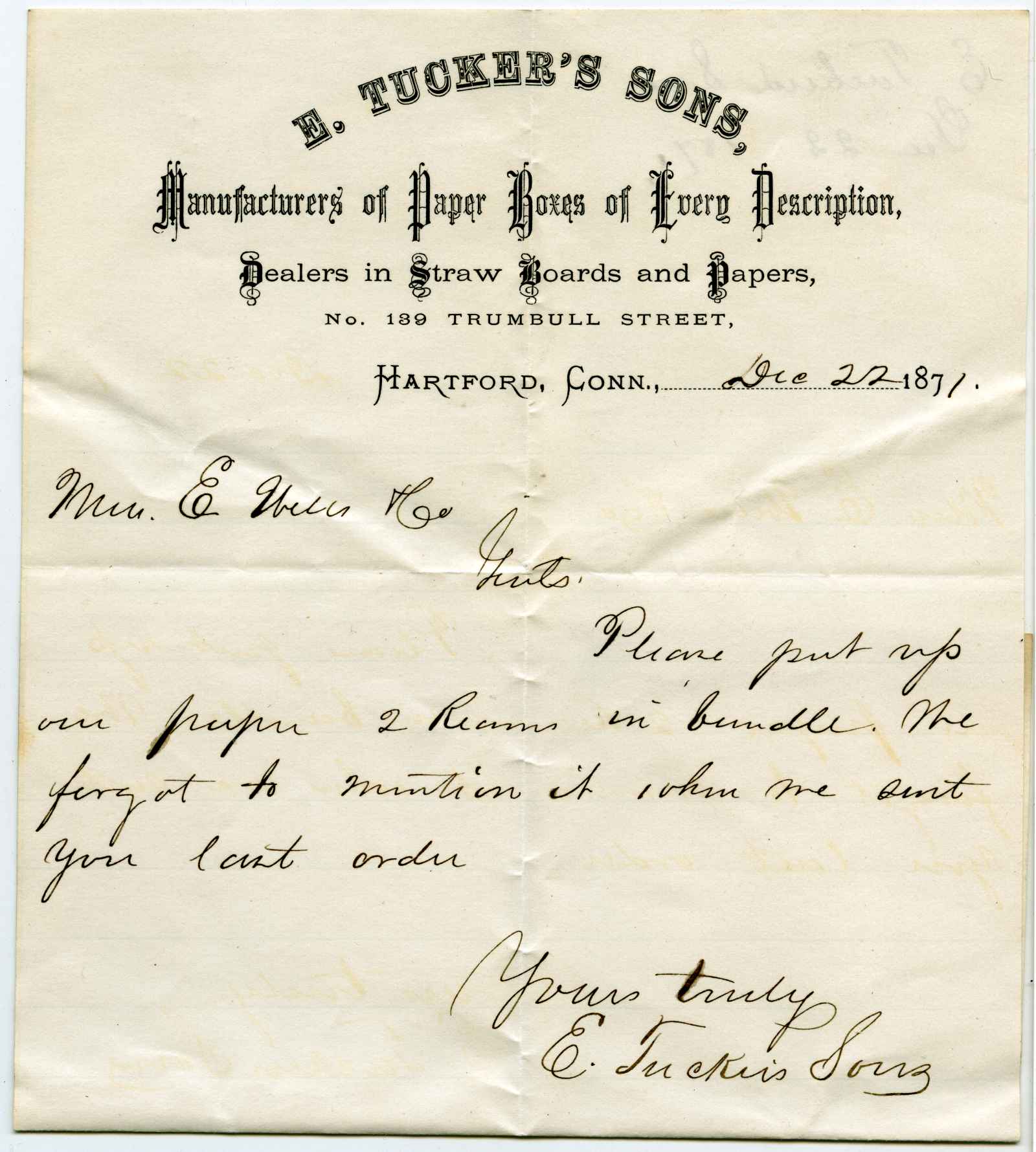 letter; Tucker, E. & Sons - Manufacturers of Paper Boxes - 139 Trumbull St. Hartford, Ct.